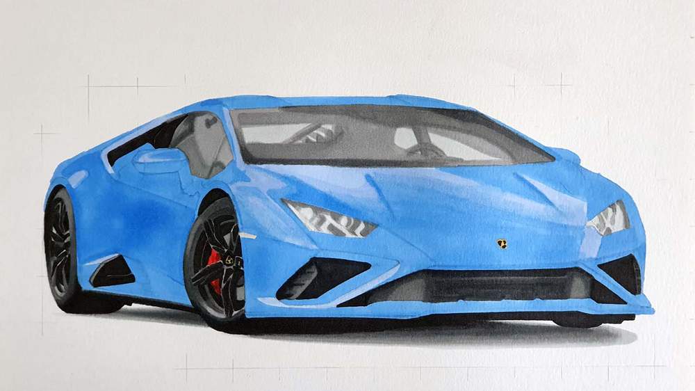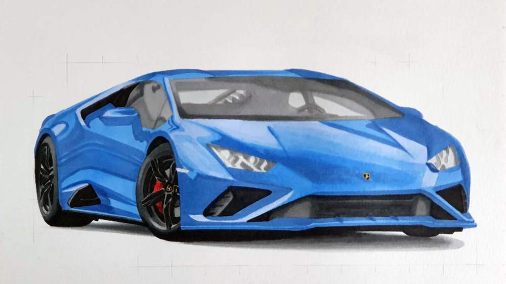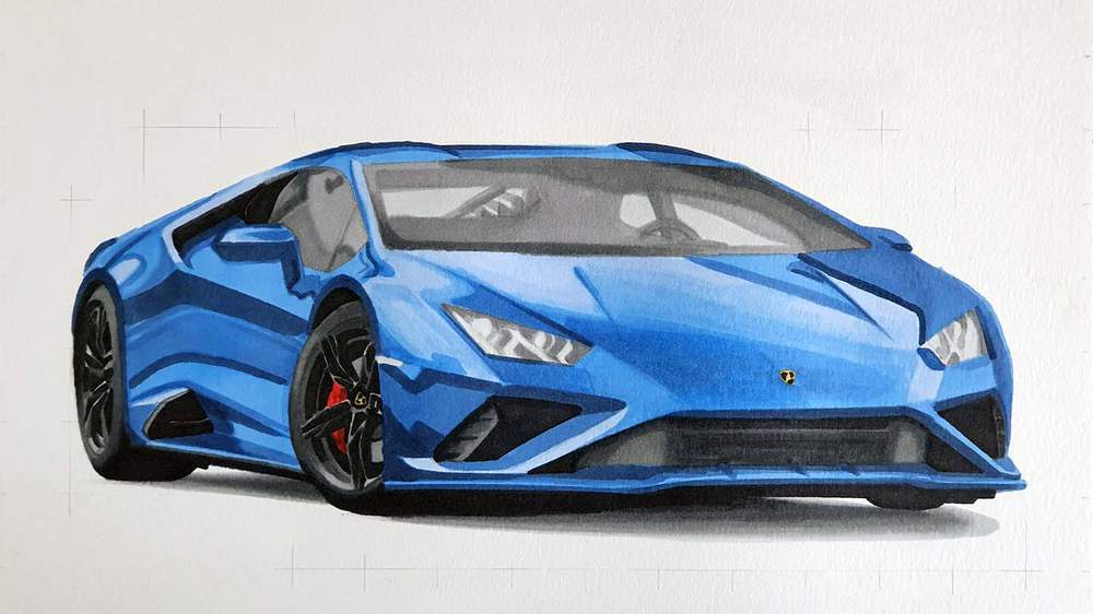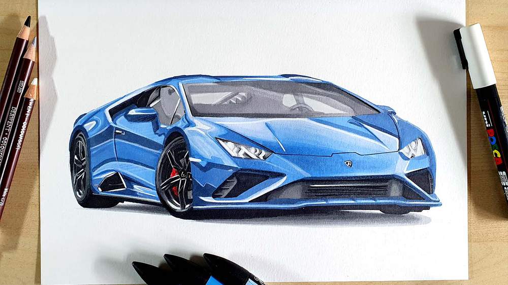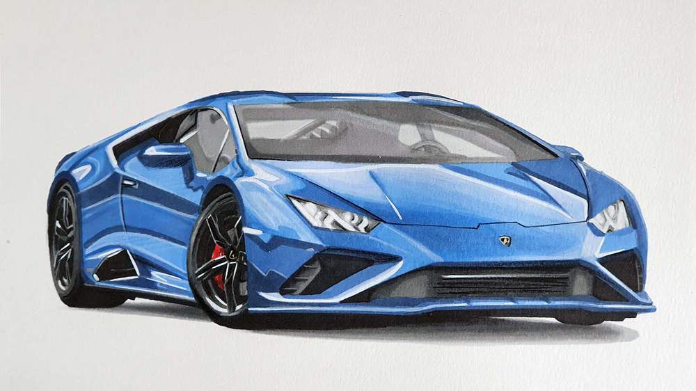 In today's car drawing tutorial, I'm going to show you how to draw a Lamborghini Huracán Evo in my dream spec: Blu Cepheus Pearl with red calipers.
