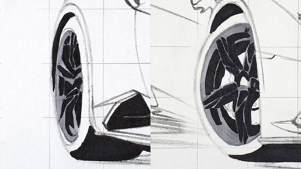 But before I colored the wheels, I erased the sketch until it was barely showing. This prevents the sketch from showing through the ink of the marker and ruining the end result. You'll need to do this for every step.