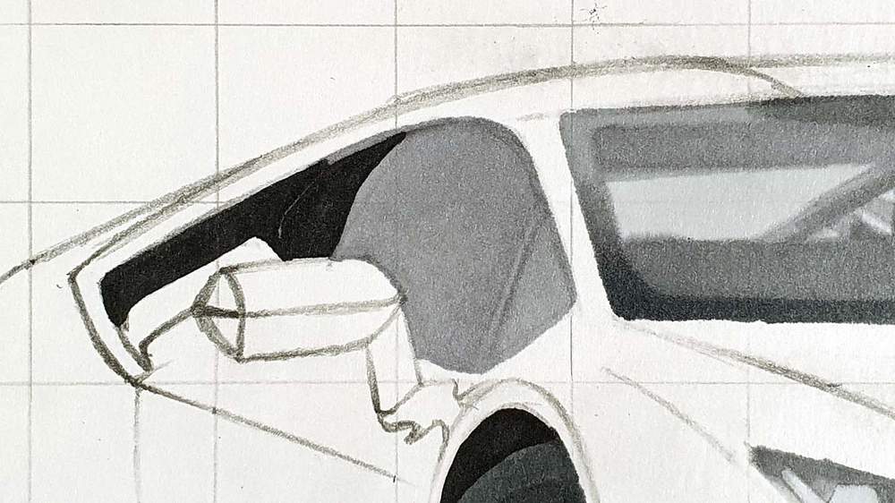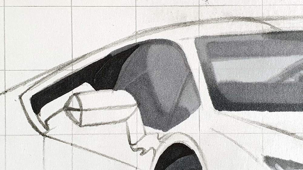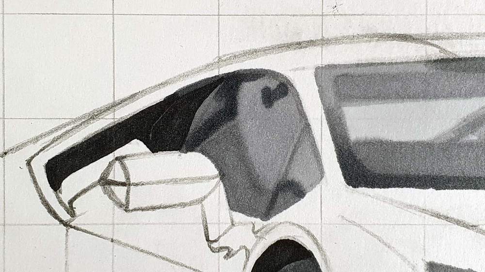 When the grid was done, I started sketching the car. I first sketched the outline and the basic shapes. After that, I added in all the details.