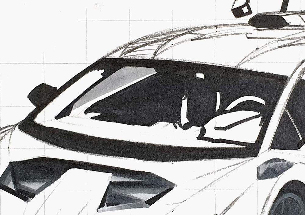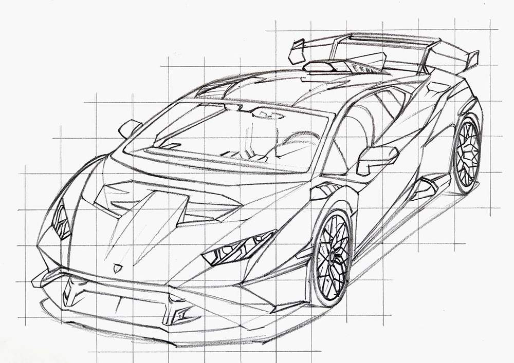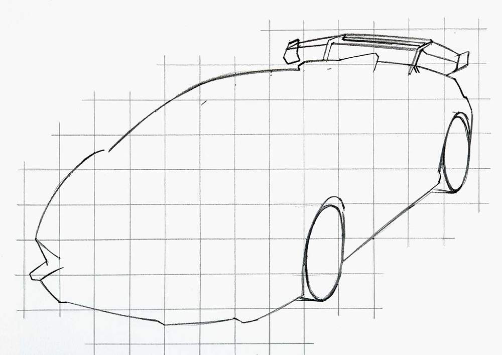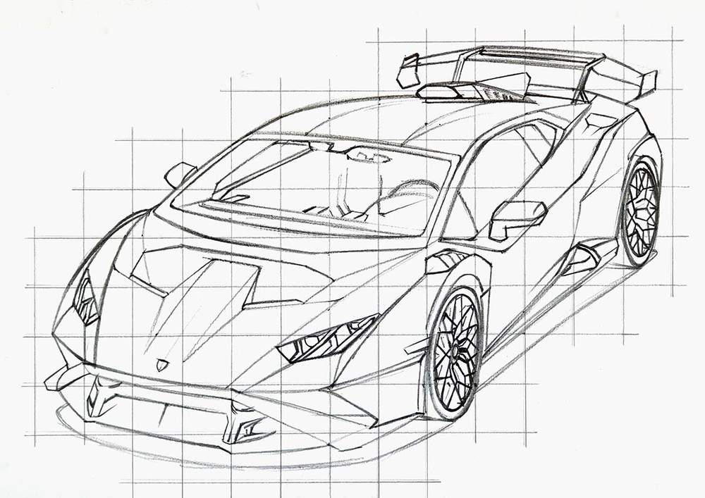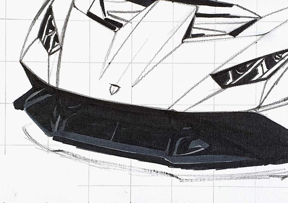 To sketch the outline of the Lamborghini Huracan STO, I like to use the grid method. This technique makes sketching cars' proportions accurately a lot easier. Here's a more in-depth tutorial on how to use this technique.