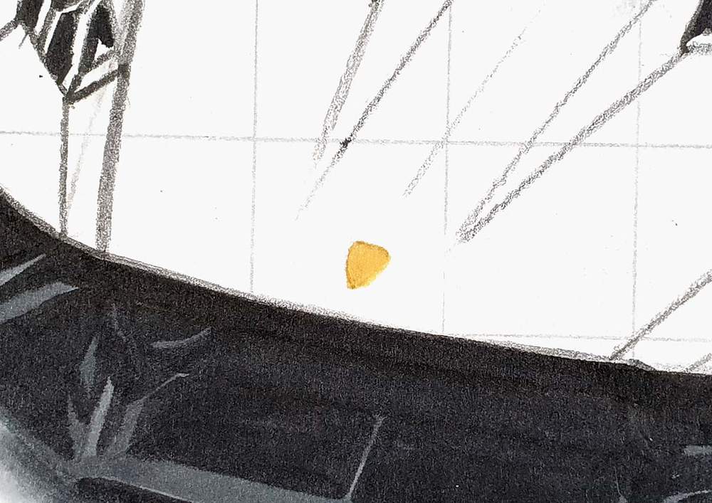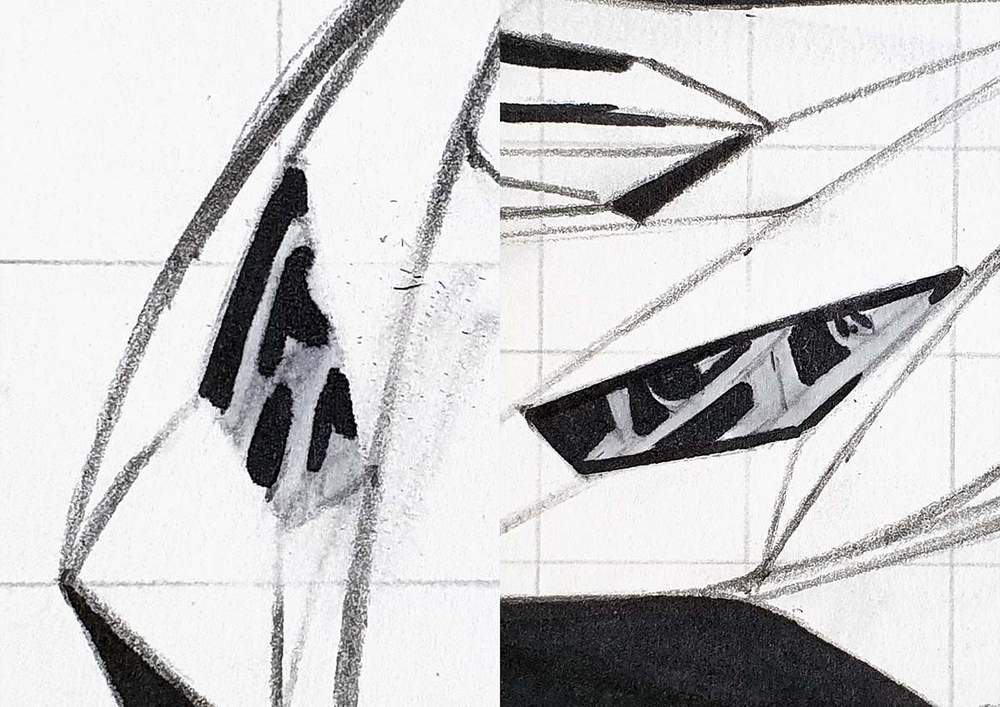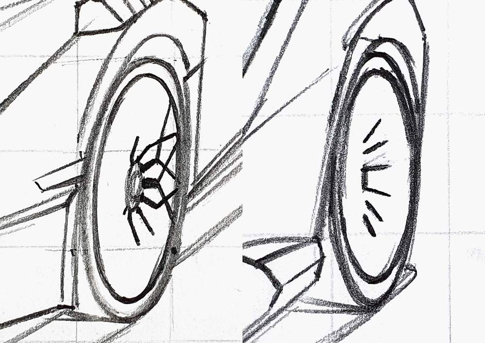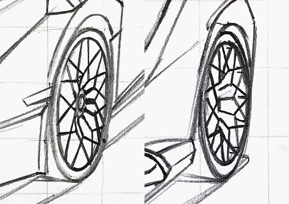 Then I sketched the lines coming out from the center. These lines are only visible on the right side of the wheels.
