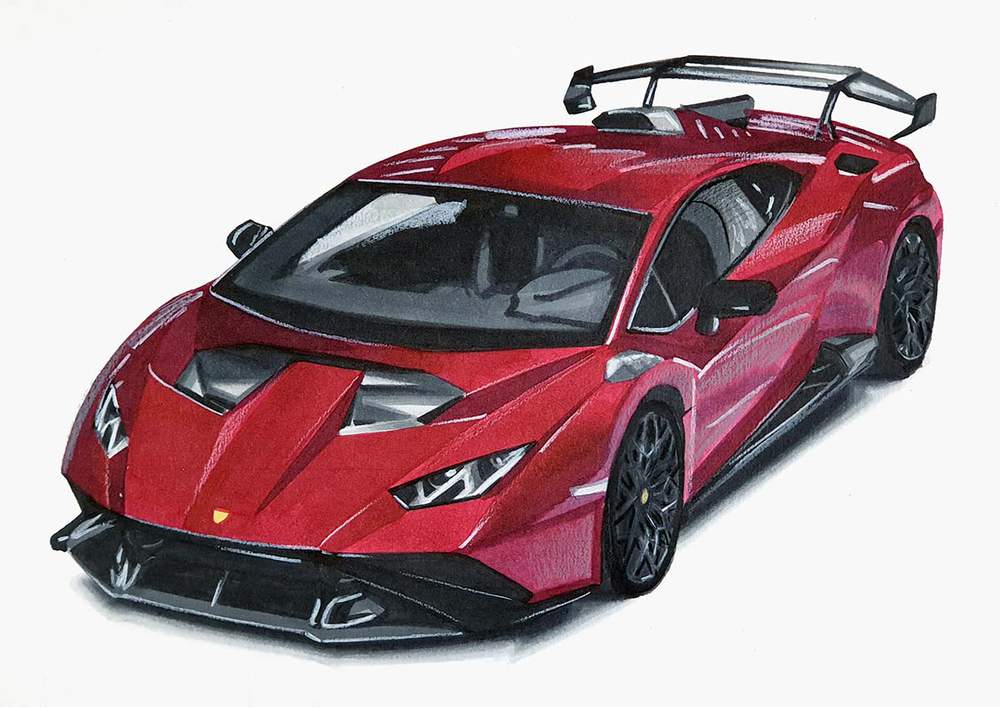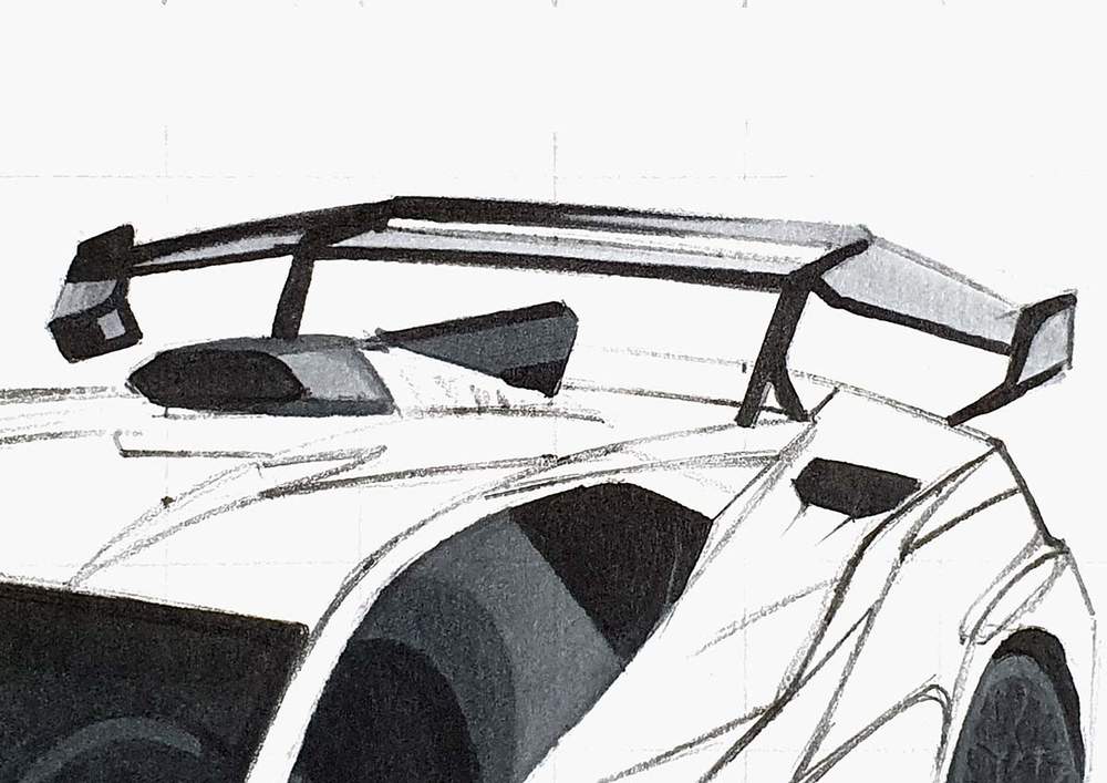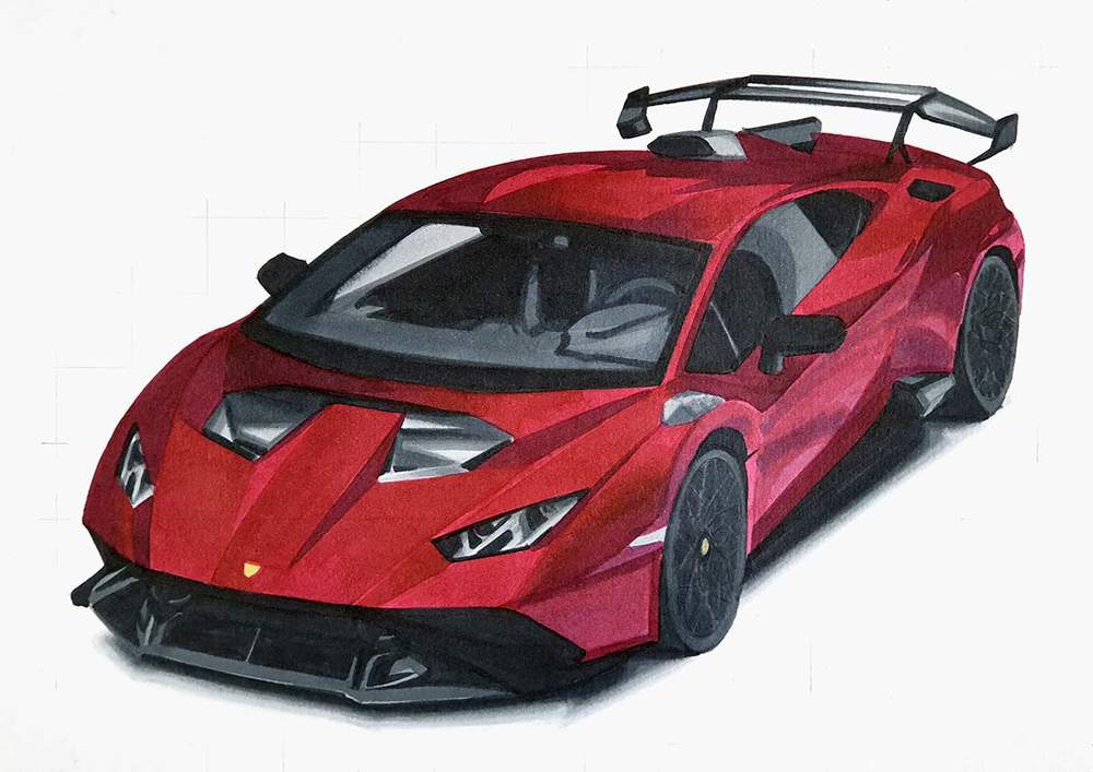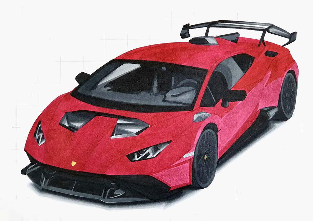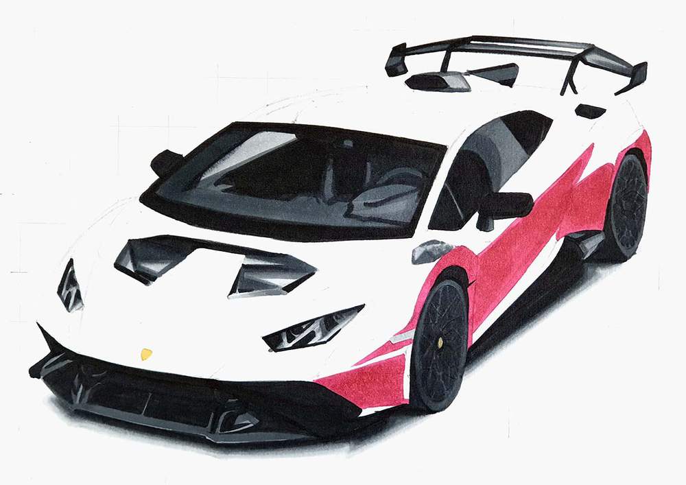 To make this drawing of the Lamborghini STO, I used 3 reference photos. 1 for the proportions and the perspective, 1 for the lighting and the reflections, and 1 for the color.