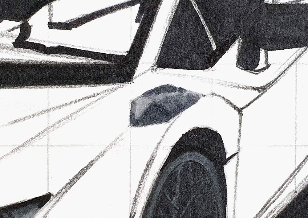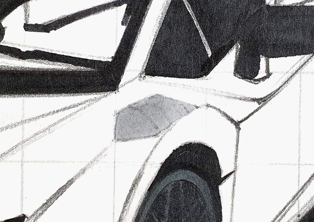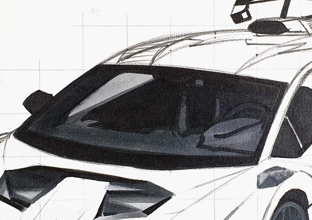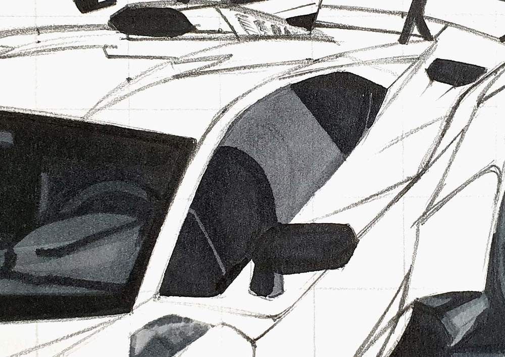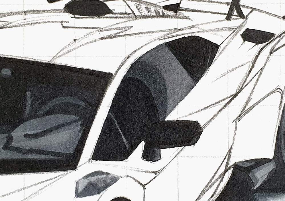 To make this drawing of the Lamborghini STO, I used 3 reference photos. 1 for the proportions and the perspective, 1 for the lighting and the reflections, and 1 for the color.