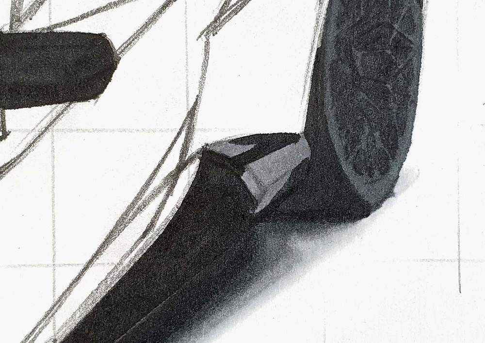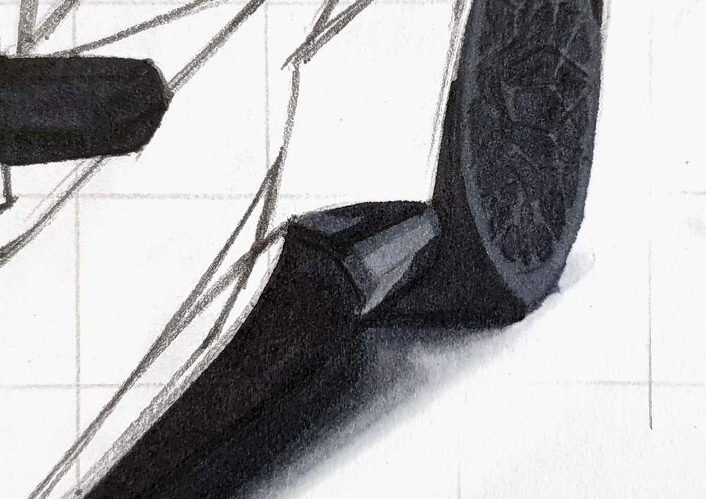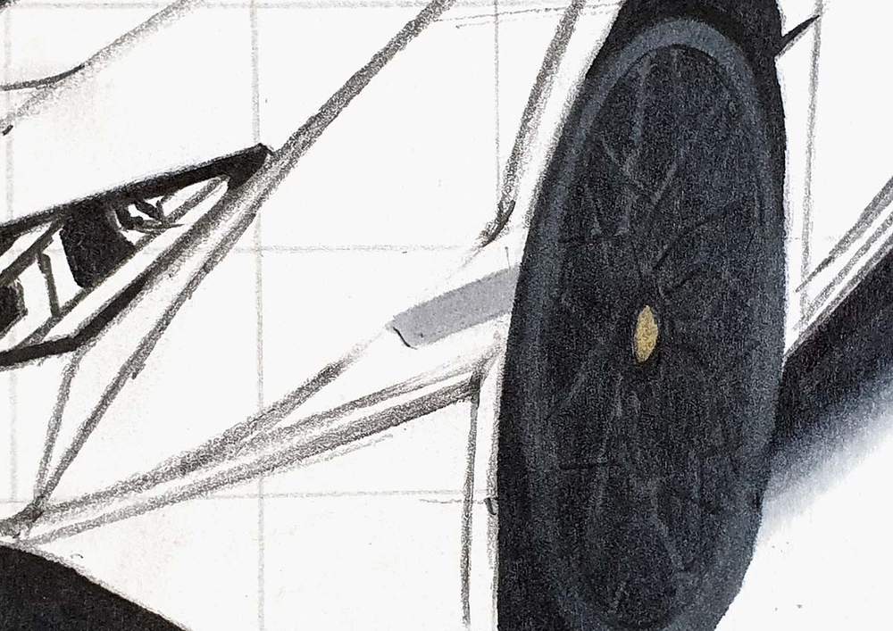 50. Use the Dove Grey pencil to add grey reflections to the light reflections on the side of the STO and to refine the spokes of the wheels.