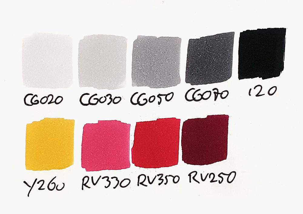 Ohuhu Honolulu markers in the colors Neutral Grey 02 (CG020), Neutral Grey 03 (CG030), Neutral Grey 05 (CG050), Neutral Grey 07 (CG070), Black (120), Yellow Dahlia (Y260), Strawberry Pink (RV330), Crimson (RV350), and Peony (RV250). I also used the colorless blender. You can also buy each color individually here;