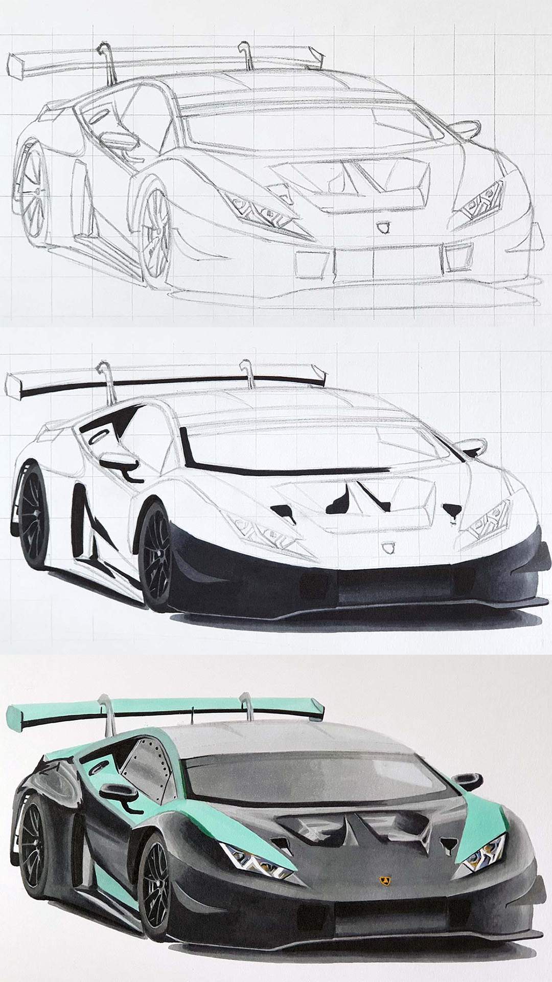 In this step-by-step car drawing tutorial, we're going to make a relatively simple realistic drawing of a Lamborghini race car: The Lamborghini Huracán GT3 Evo.
