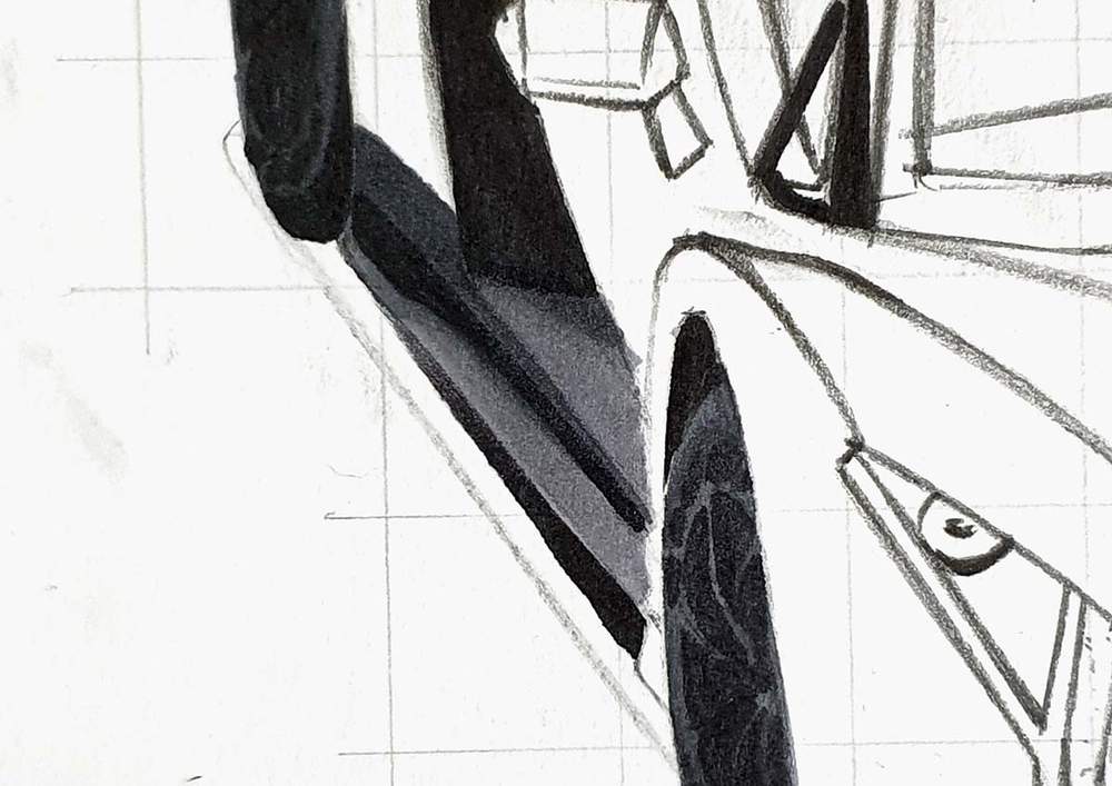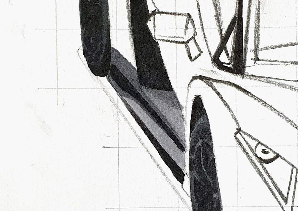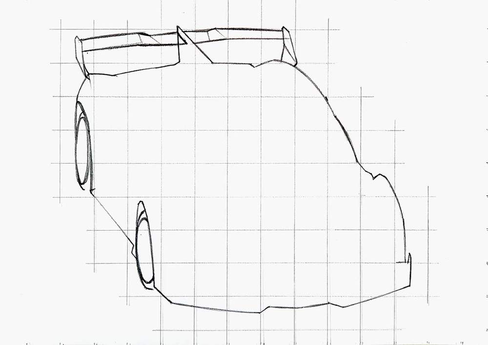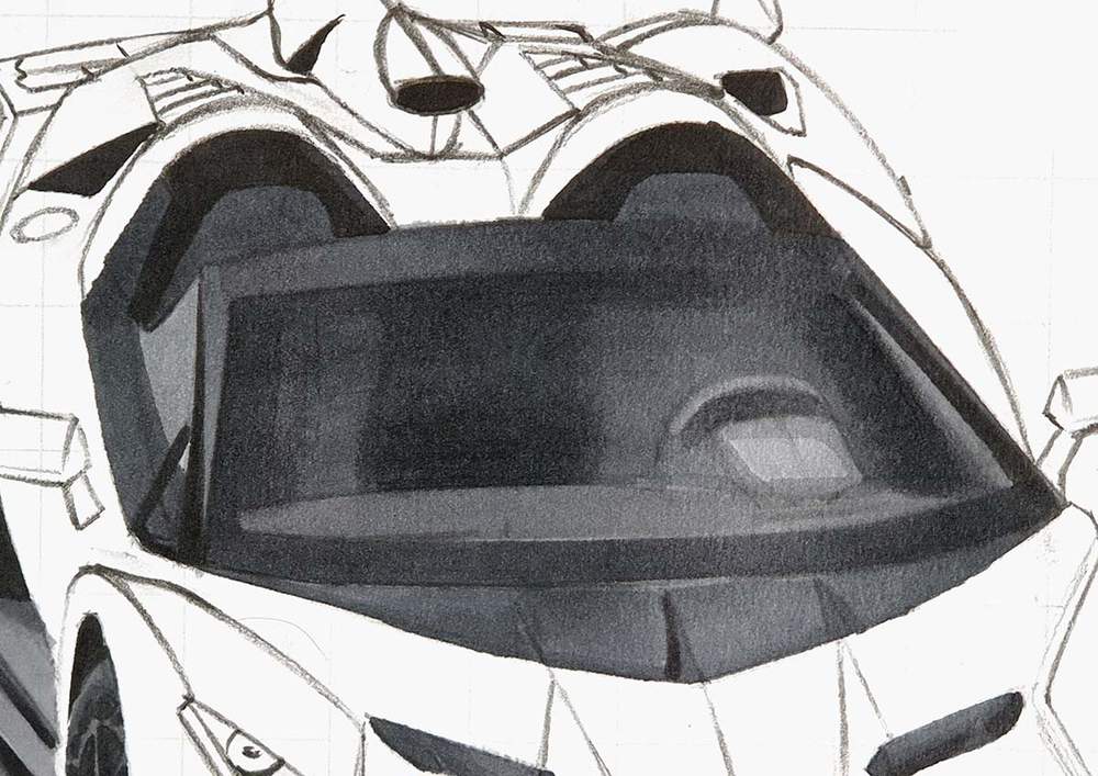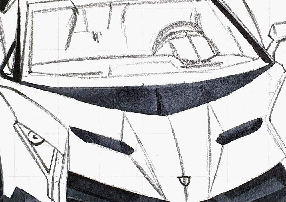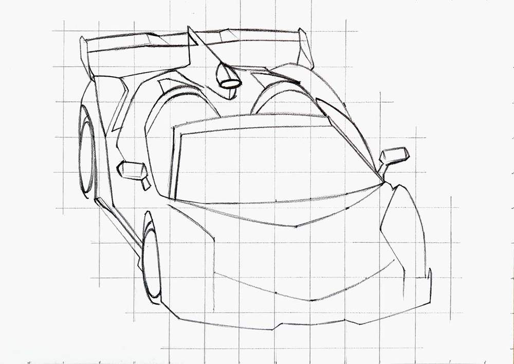 5. Sketch the biggest shapes of the car like the windshield outline, the mirrors, and the basic shape of the front panels.