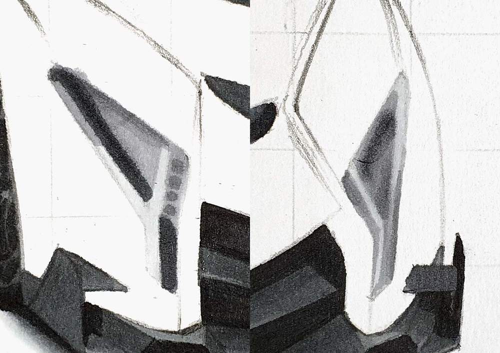 12. Use Ice Grey 4 to darker the left and the top bit of the lower part and color the left and the bottom of the top part. Also, color a diagonal darker reflection below the big air intake.