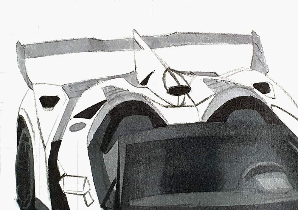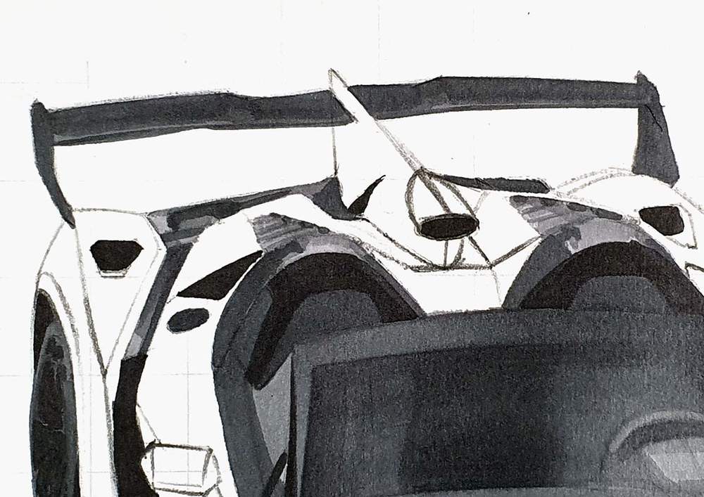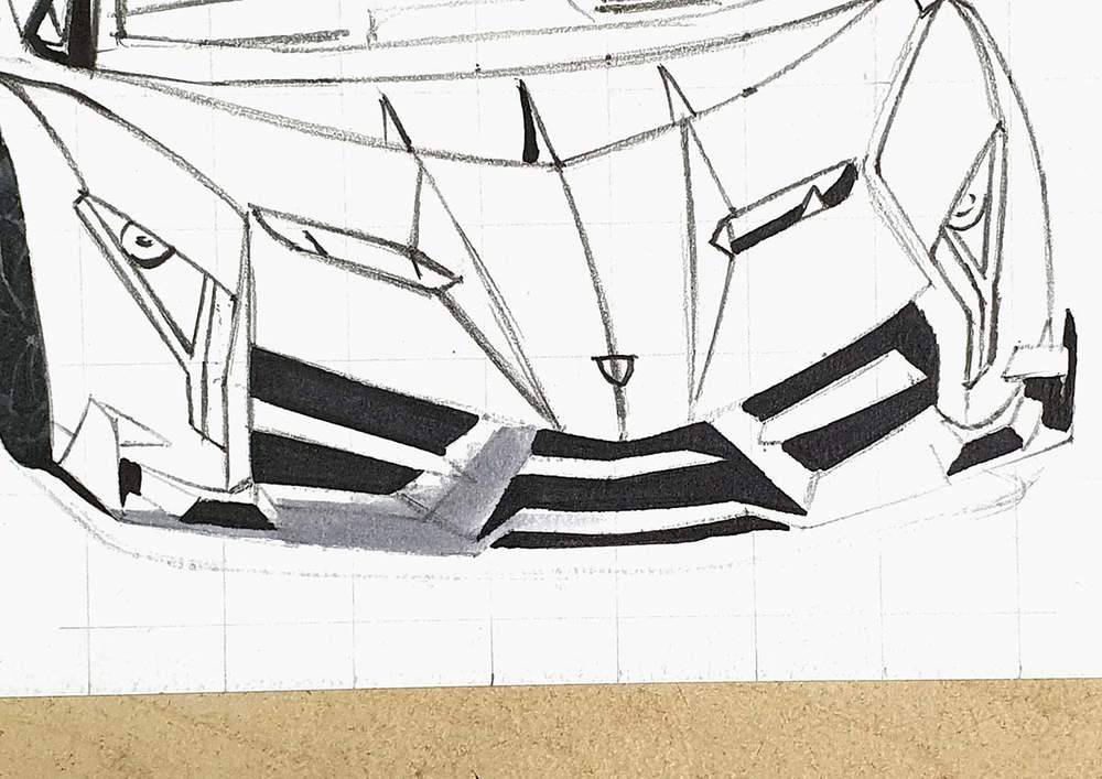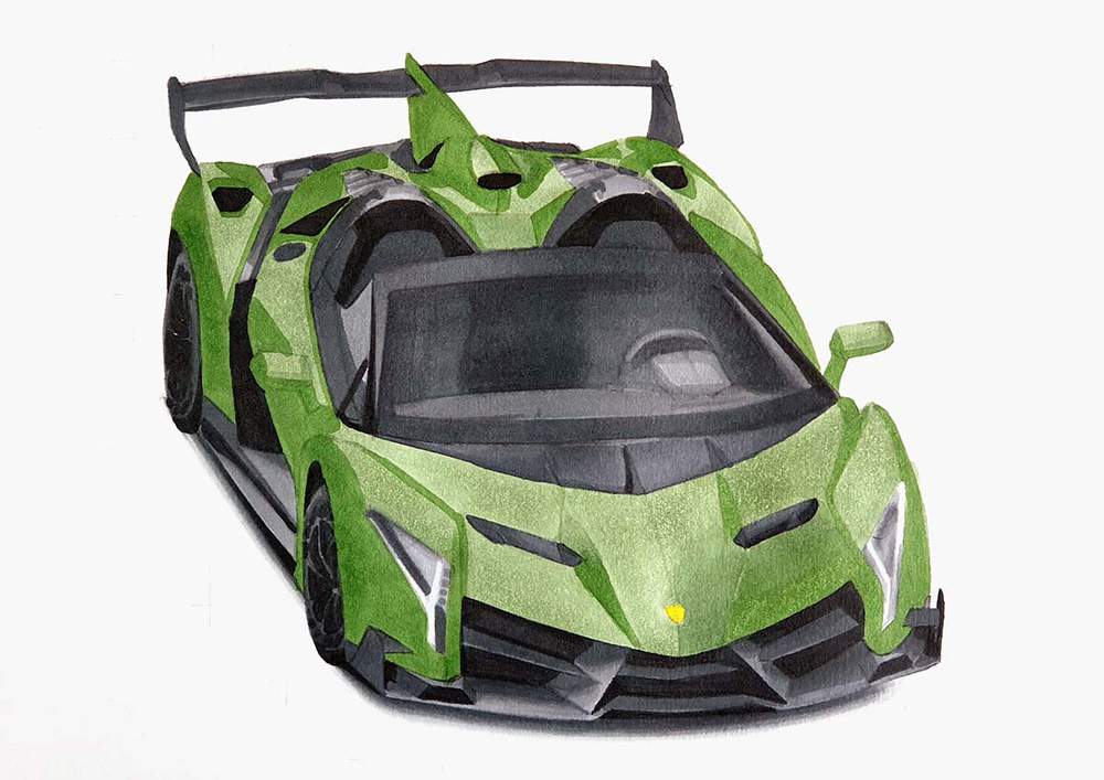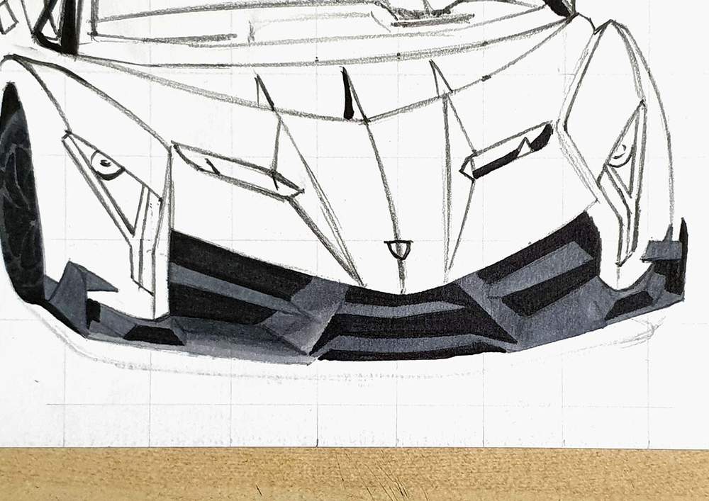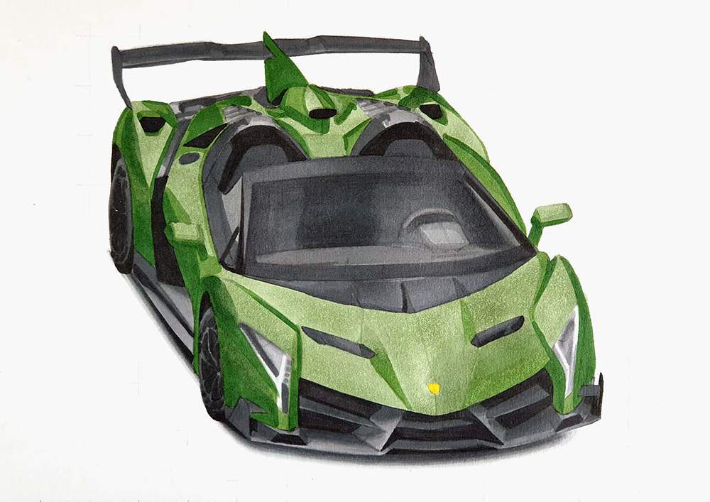 Next, color the car with alcohol markers starting with the black and the grey parts, before moving on to the main body of the Veneno Roadster.