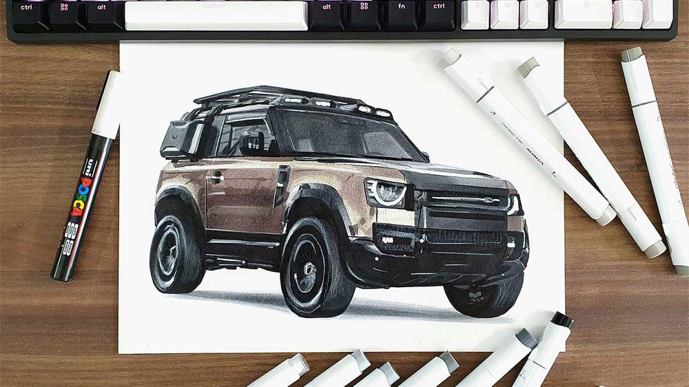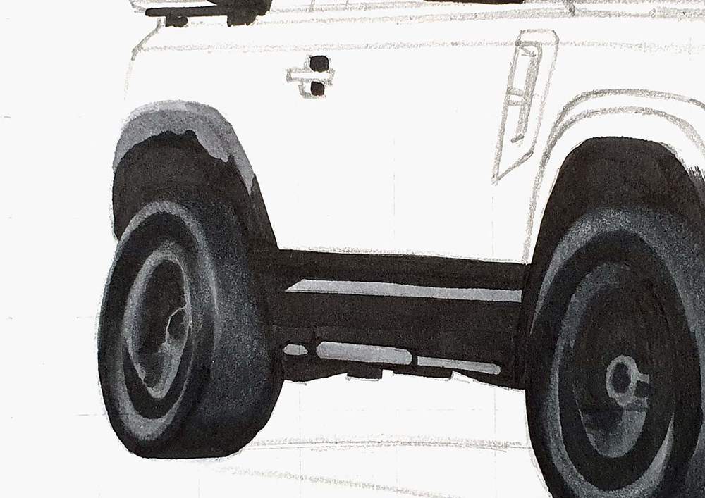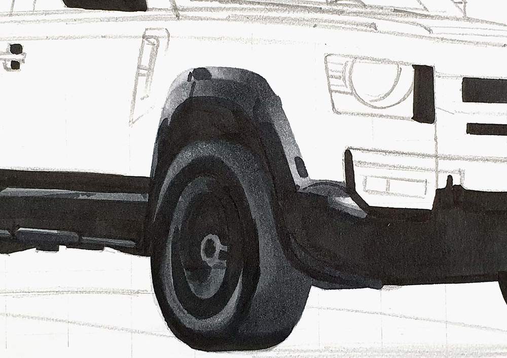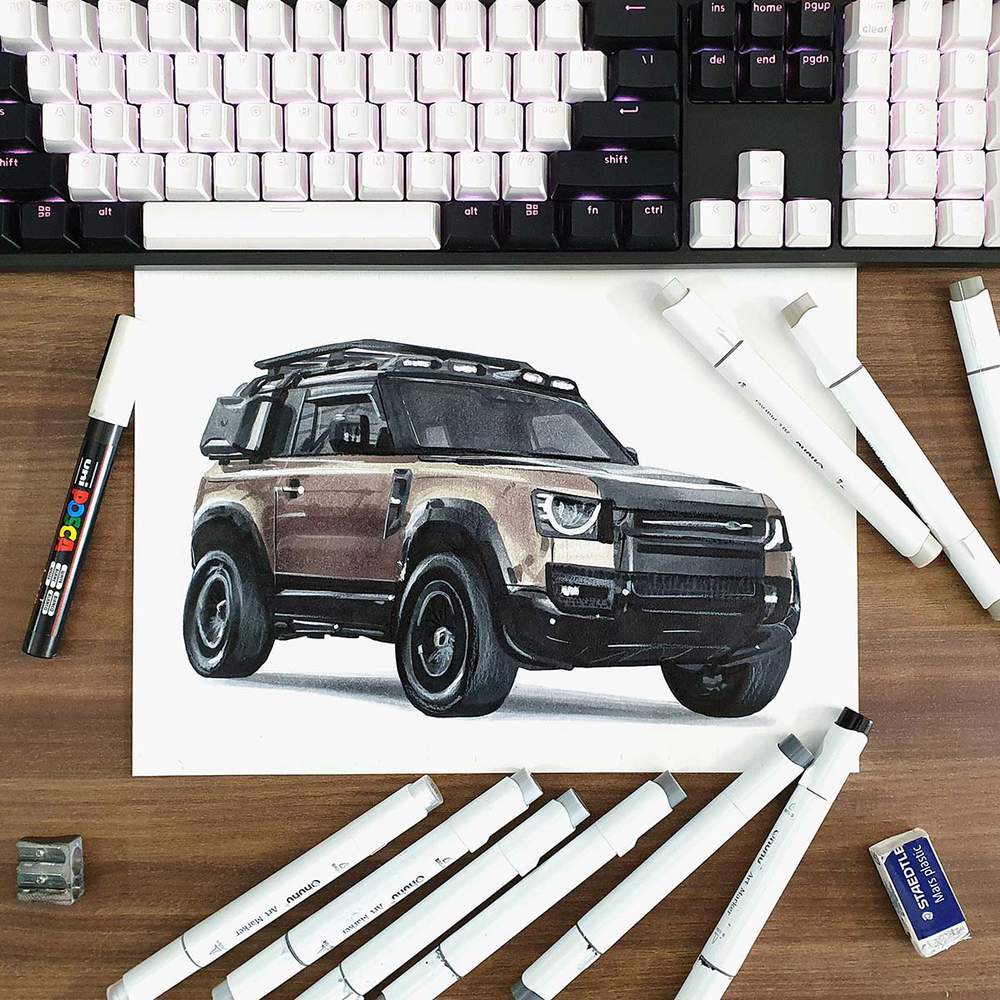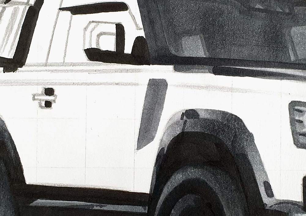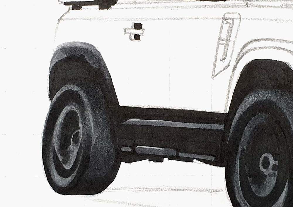 In this week's car drawing tutorial, I'm going to show you step-by-step how I drew this beautiful rolling shot of a Land Rover Defender.