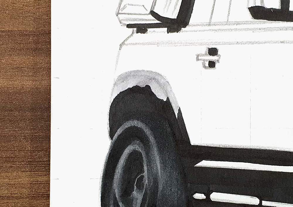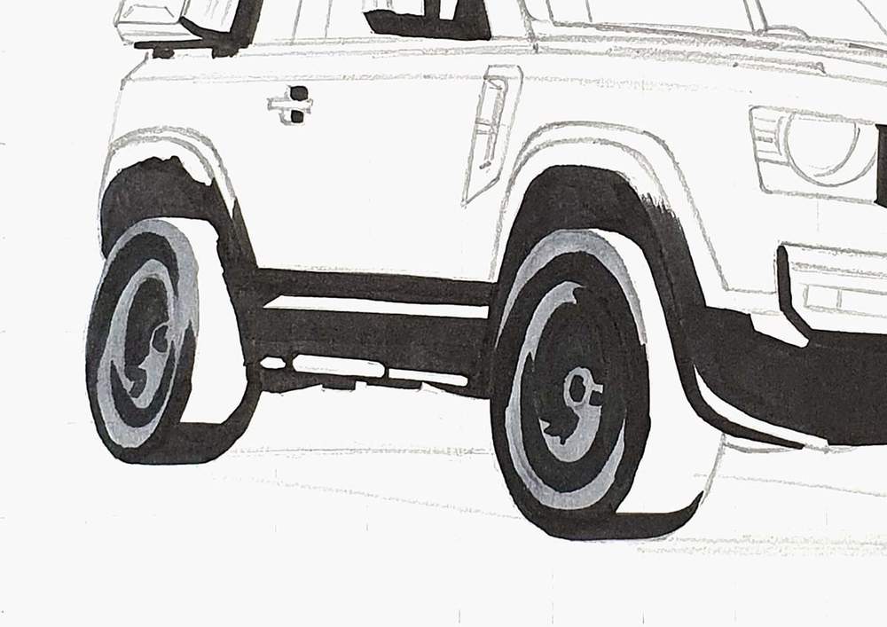To fully finish this Defender drawing off, I used a white paint marker to add a few highlights on the car.