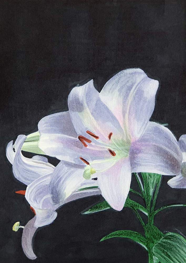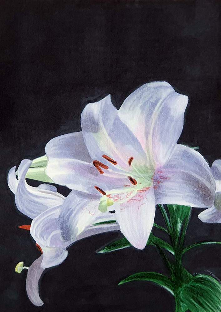 I also used the white pencil to add the lines of the stamens and the pistil and I used it to add some texture to the leaves on the stem.
