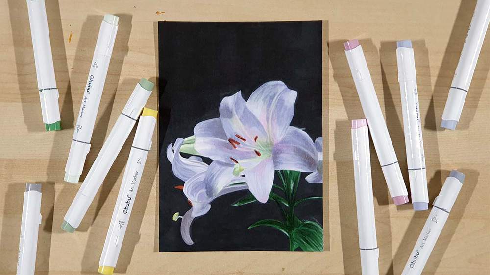 To draw a lily flower, you start by sketching the basic shape of the flower. Then refine your sketch by adding the individual leaves and then the details. Next, use markers to color the whole flower and work from light to dark. Then you add details with a few colored pencils.