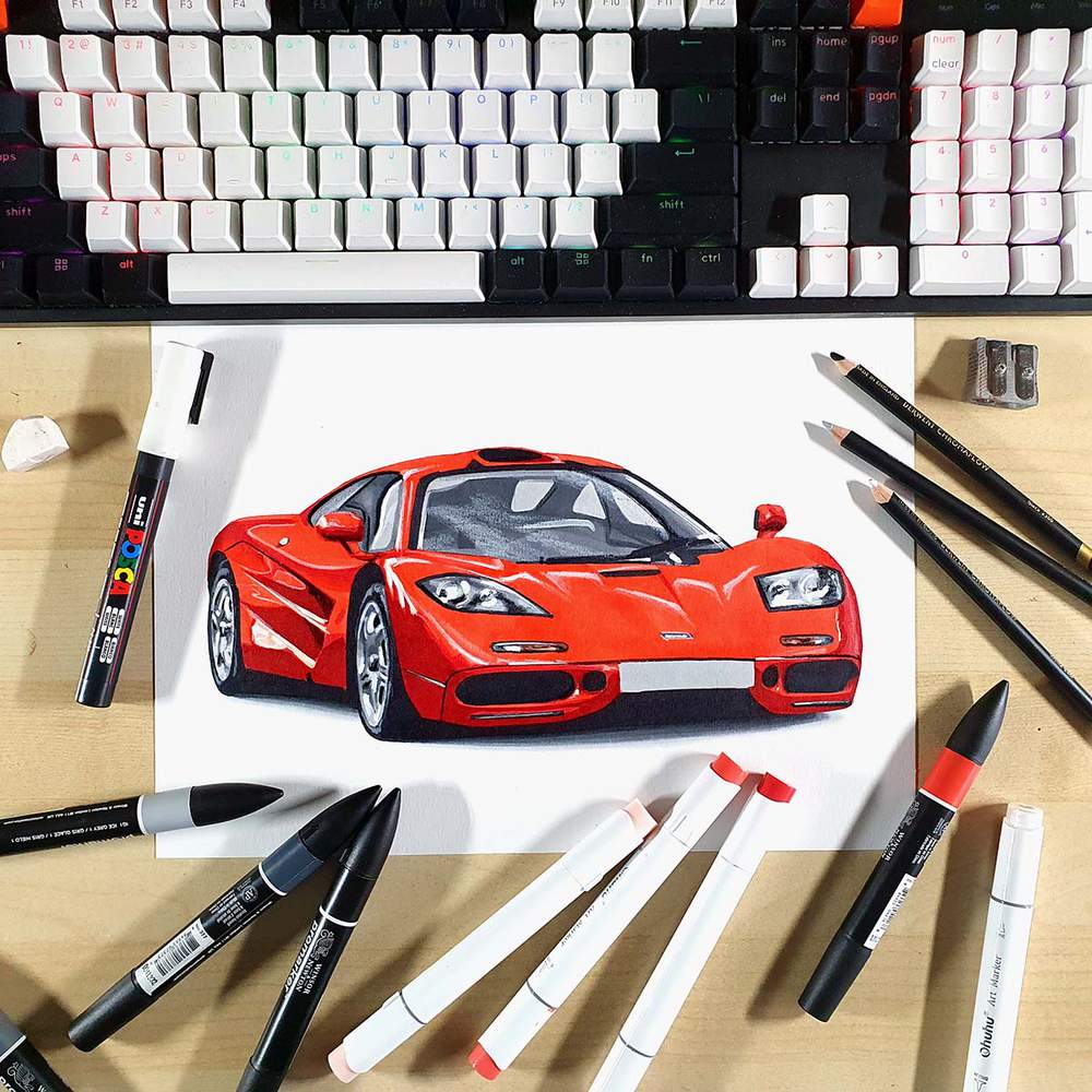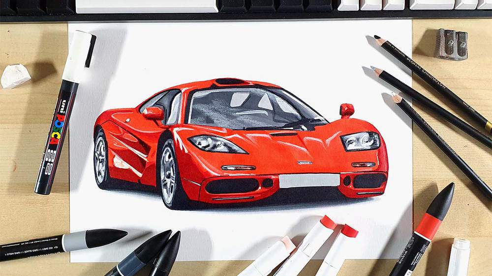 To create a realistic McLaren F1 drawing, you'll first need to find a good reference photo. Next, you sketch the outline of the car. After that, you color the car, part by part until it is fully colored. And to finish it off, you add a few details with colored pencils and a few highlights with a white paint marker.