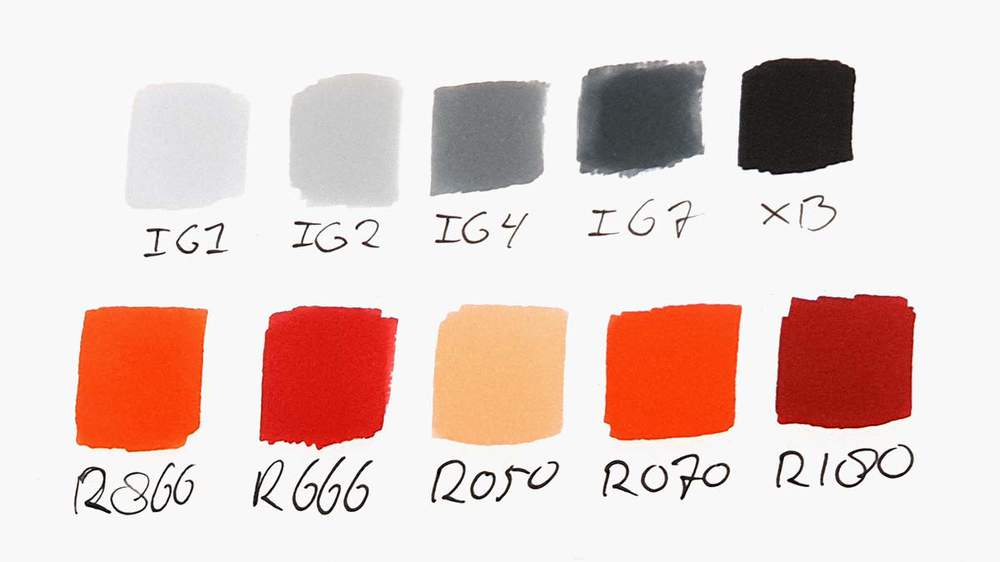 I used the Winsor & Newton Promarkers in the colors Ice Grey 1 (IG1), Ice Grey 2 (IG2), Ice Grey 4 (IG4), Ice Grey 7 (IG7), Black (XB), Orange (R866), and Red (R666).