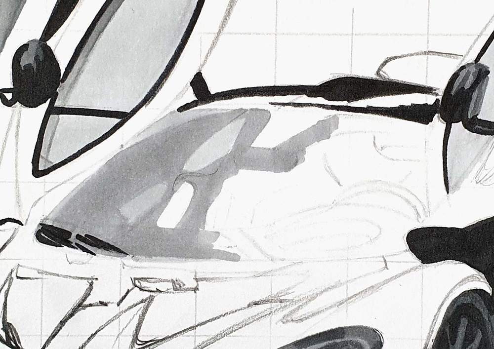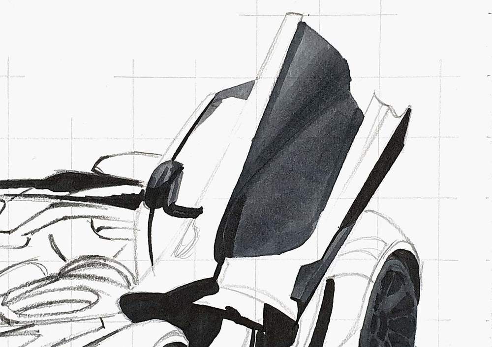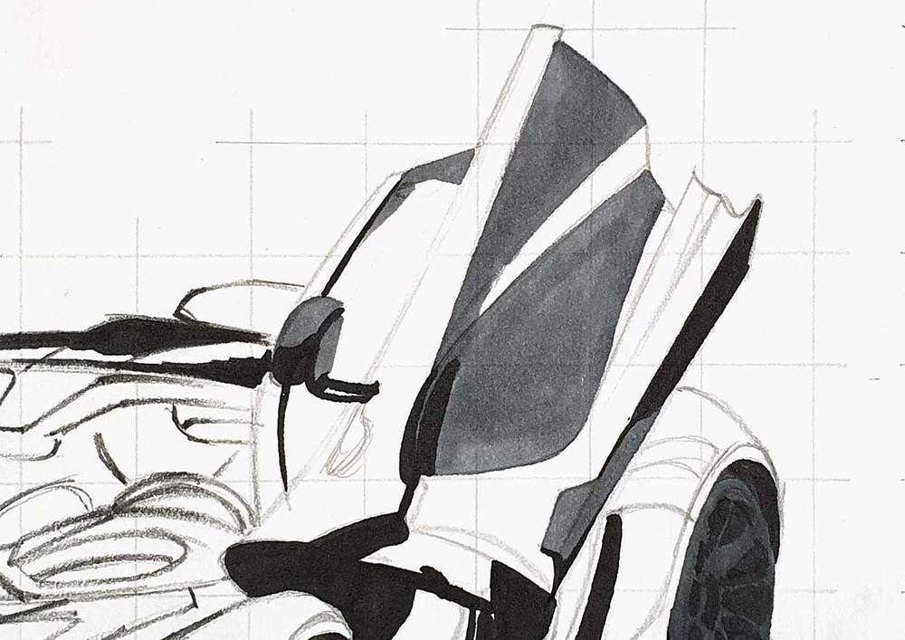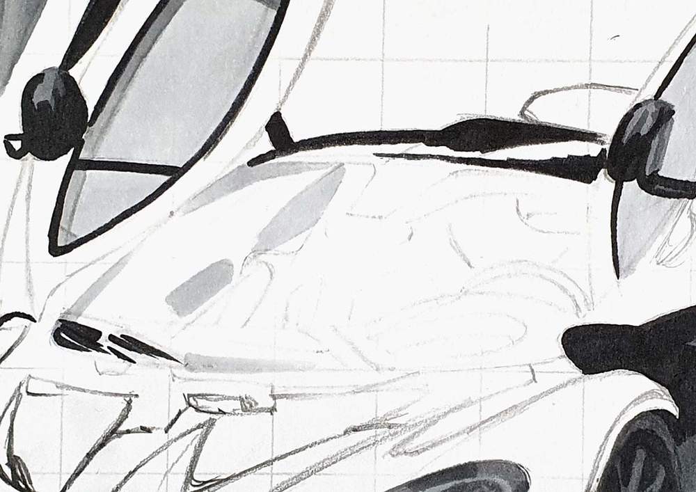 Then, I started sketching. I always start on the left of the car, choose an edge to sketch, and work my way from there up and around the car, deciding the outline into many easy-to-draw lines.