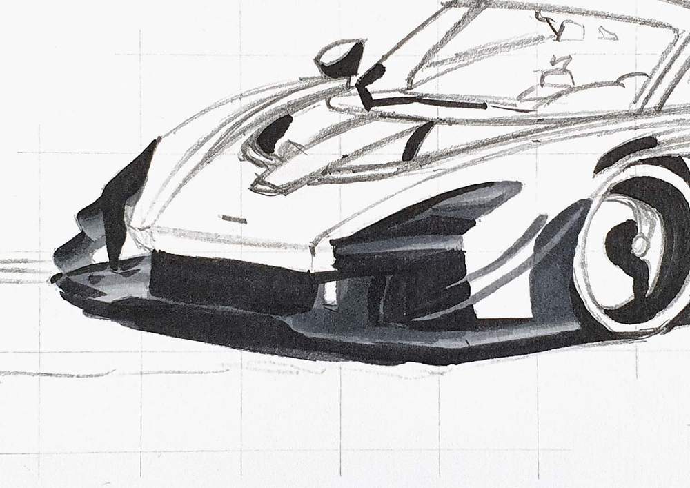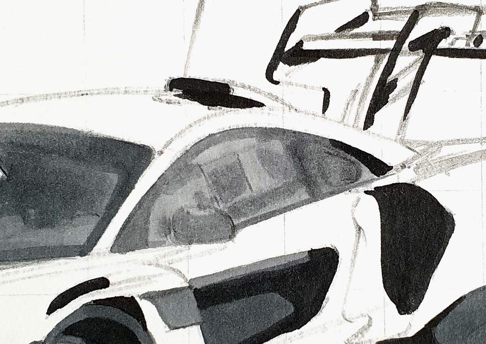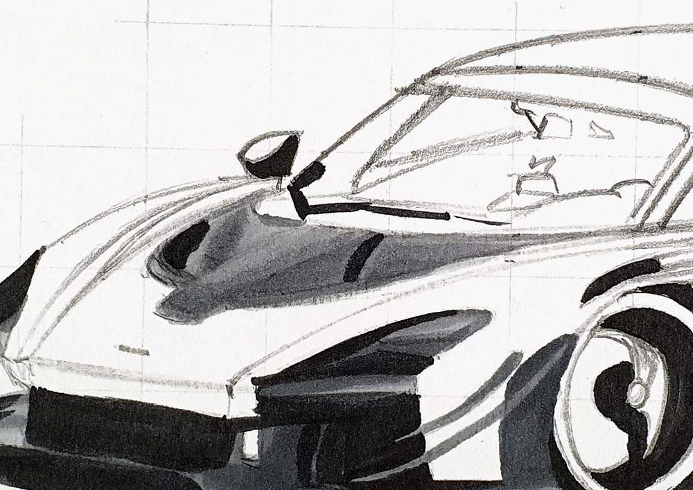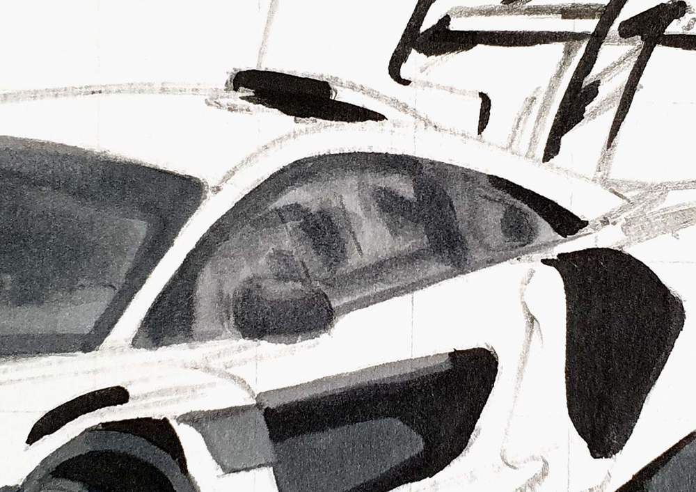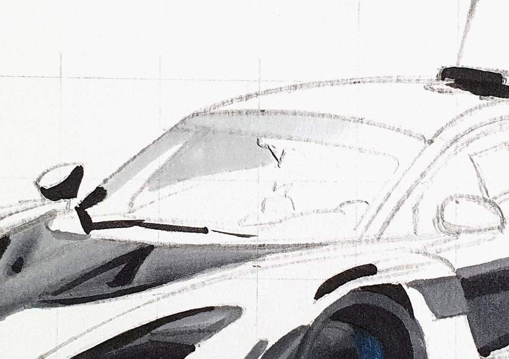 I started by picking any line on the outside edge of the car. I then marked where it starts, where it ends, and where it crosses grid lines. After that, I sketched the line in one swift motion.