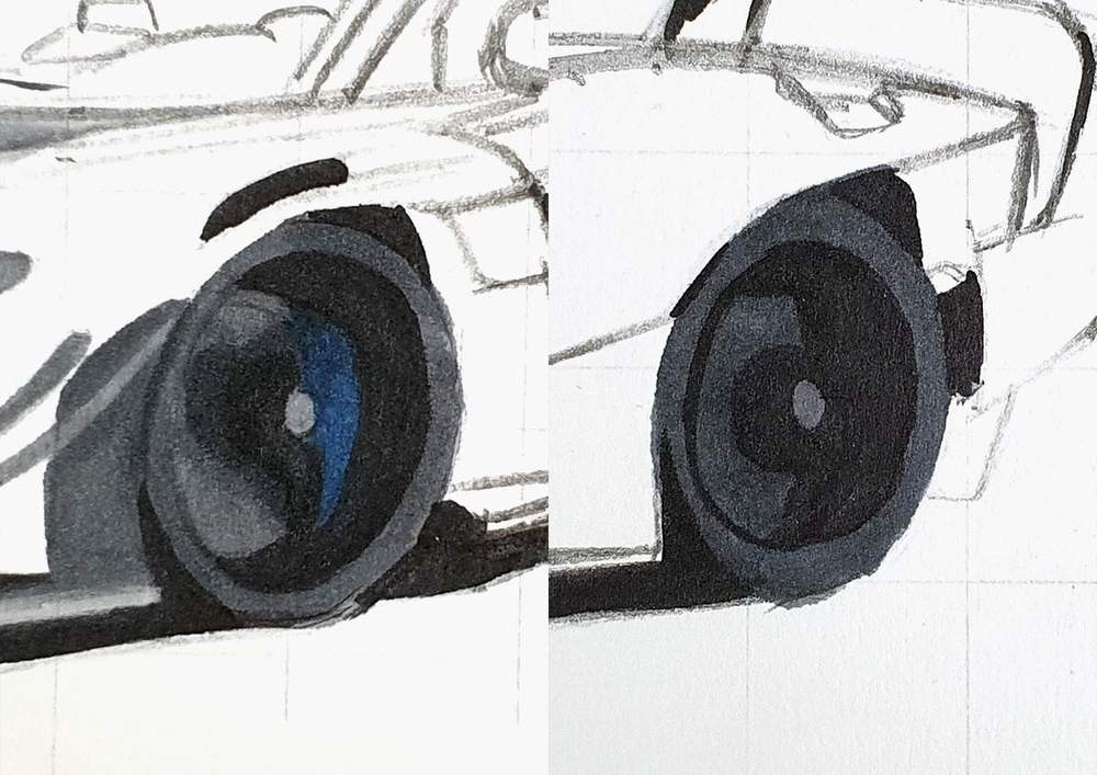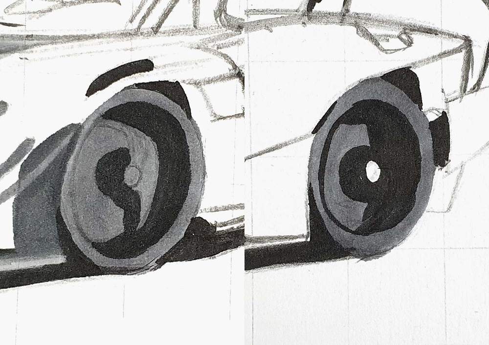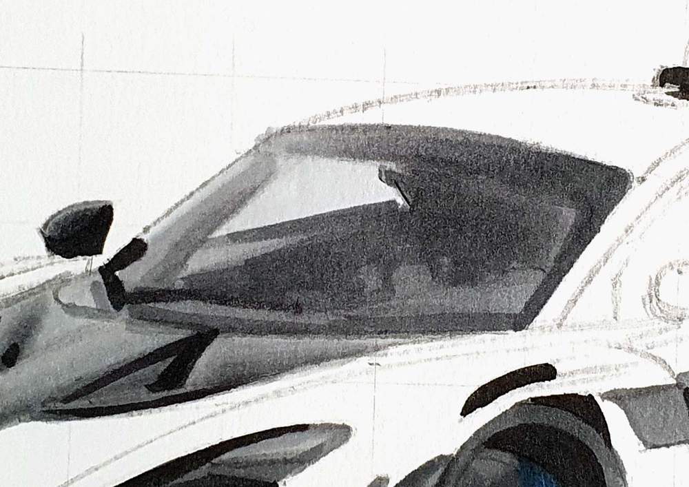 I used the white pencil to add highlights on all the panel edges and to add reflections all over the car and the wheels.