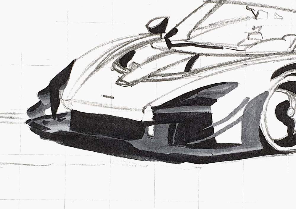 I started by sketching the basic parts of the car, like the windshield, the headlights, the front splitter, etc.