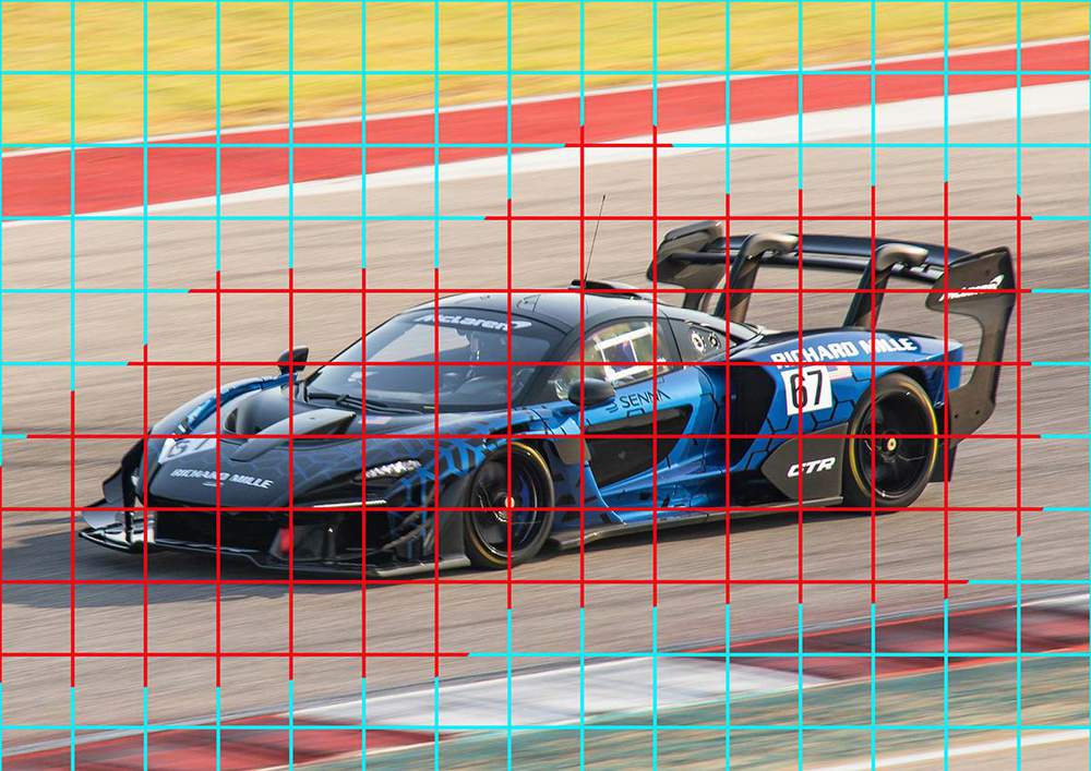 Then, I added a grid overlay of 15 by 10.5 squares on top of the photo and I marked the squares that contained parts of the McLaren Senna GTR.
