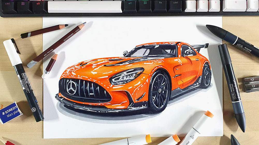 To make your own Mercedes AMG GT Black Series drawing, you first need to search for reference photos. When you've found one you like, you need to sketch the outline and the parts of the car one by one. After you've completed your sketch, you're going to color the car using markers (as this is the easiest). And lastly, you add a few details using a white, grey, and black colored pencil and you add a few highlights using a white paint marker.