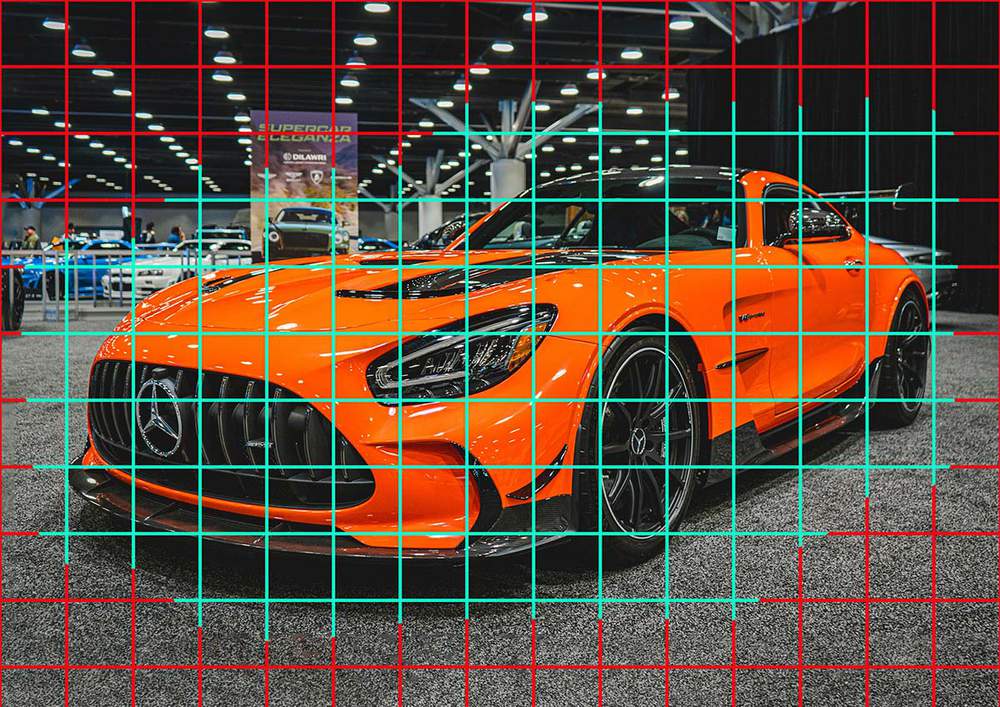 Next, I overlayed a grid of 15 by 10.5 squares on top of the photo and marked the squares that contained parts of the car in light blue.