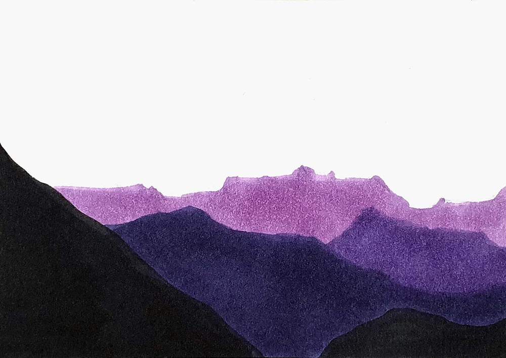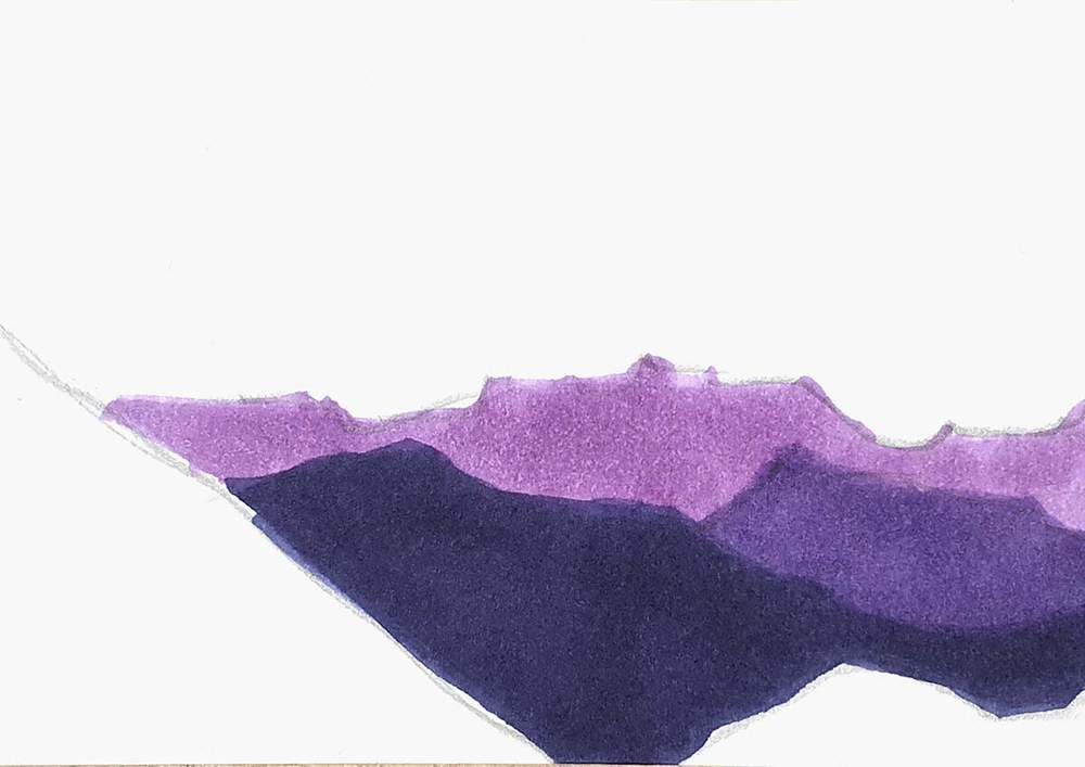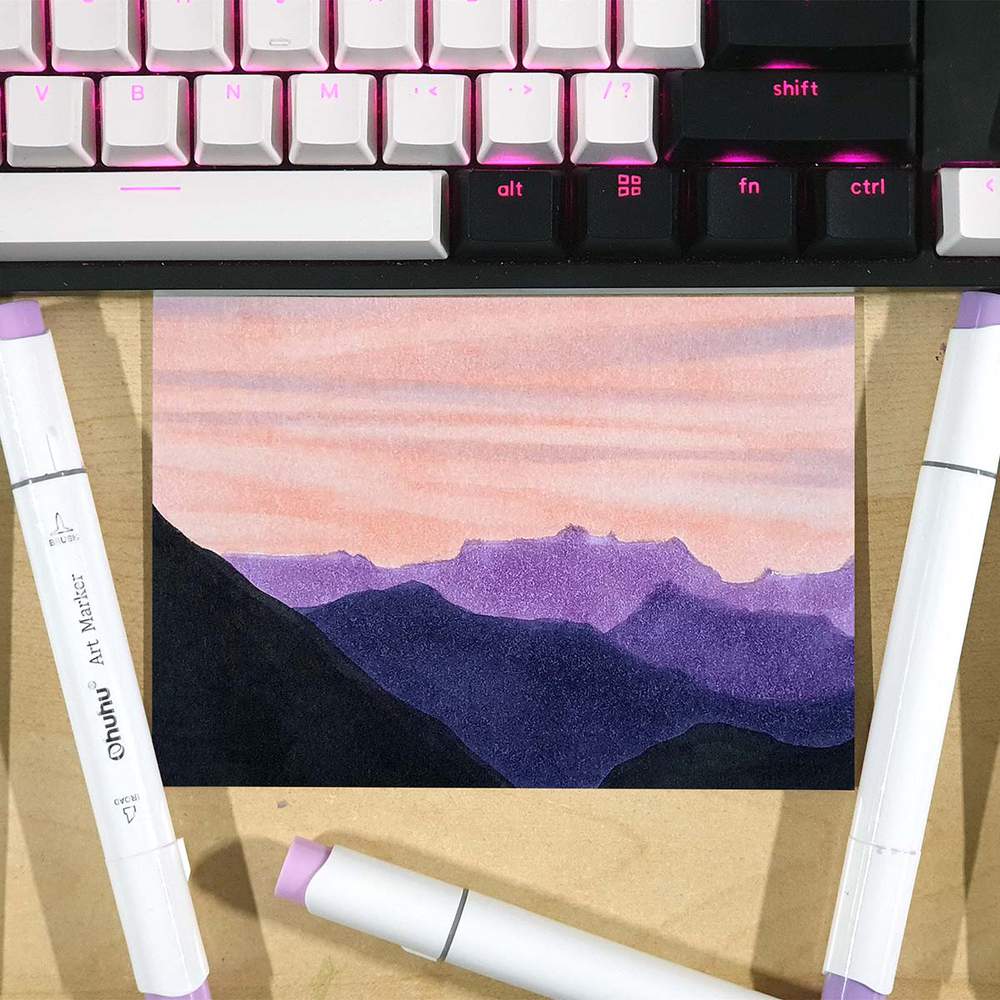 To make this mountain range drawing, I used Ohuhu Honolulu markers in the colors E030 Pink Flamingo, V050 Pearl Violet, V060 Amethyst, V450 Dark Lavender, 120 Black, V322 Rain Flower Purple, and 0 Colorless Blender.