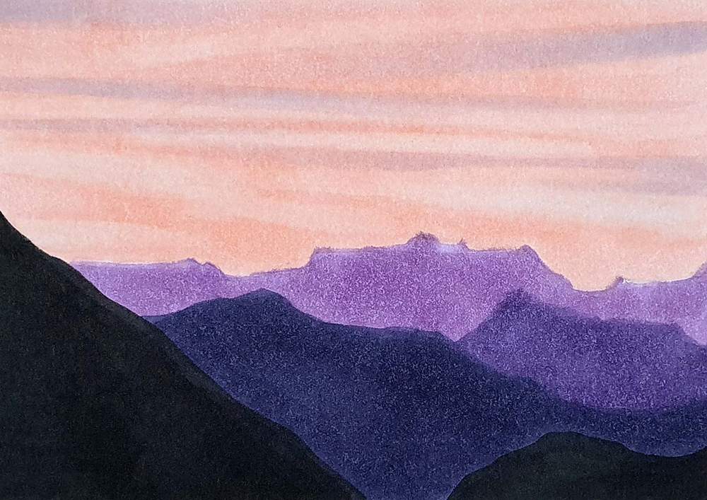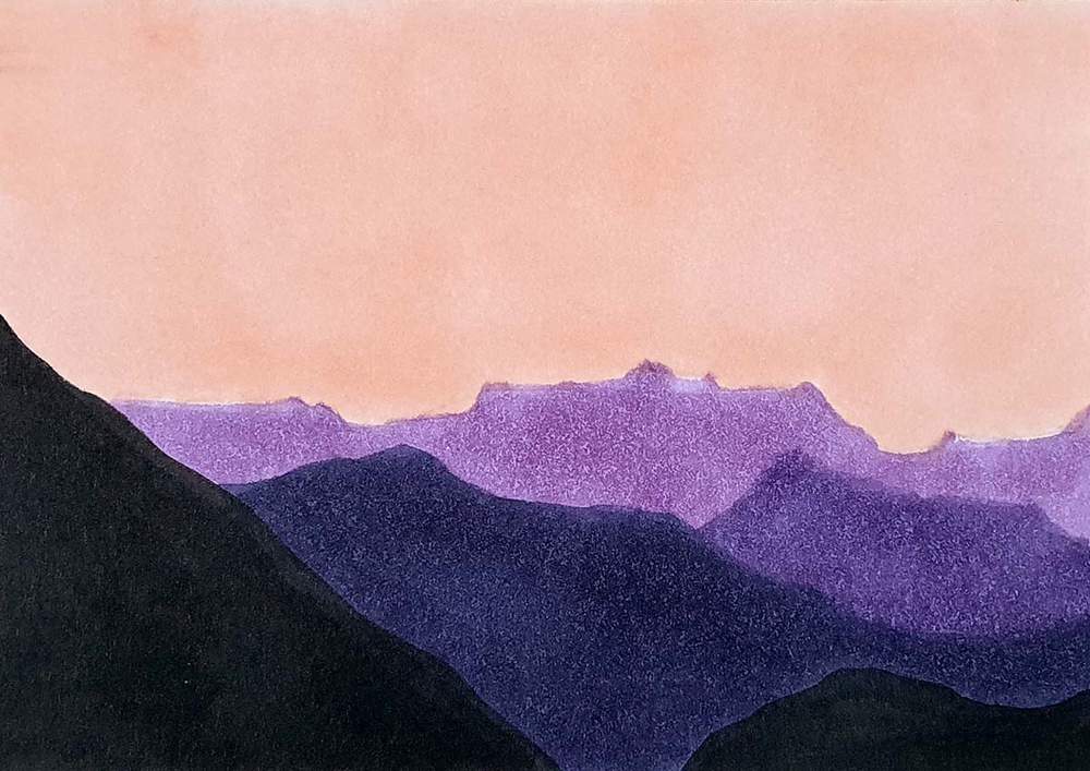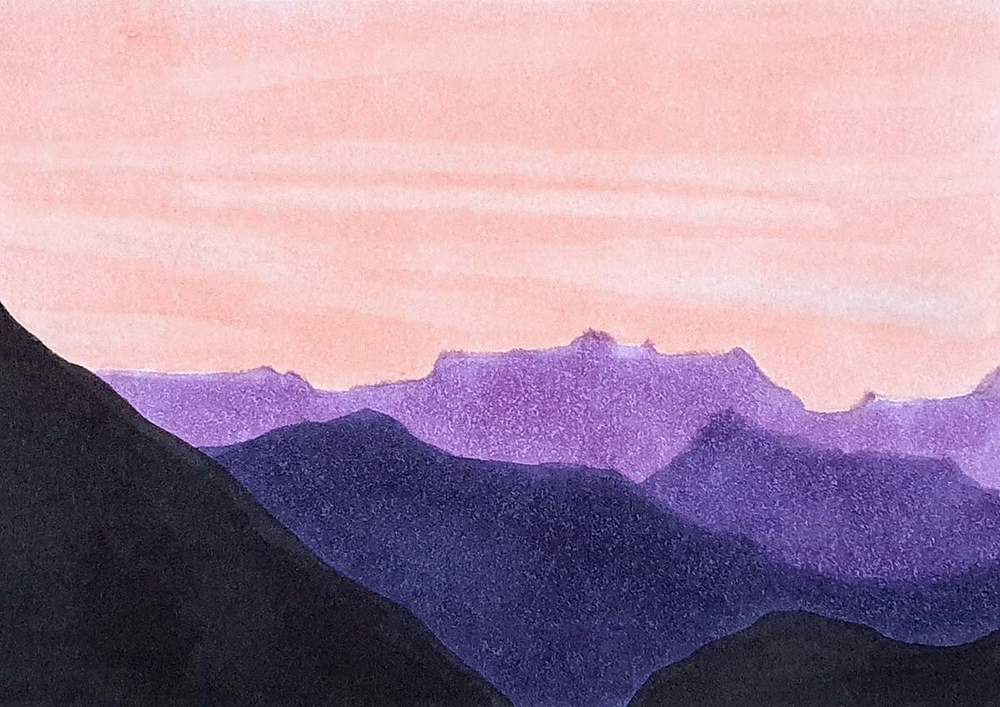 After that, I colored in the mountain range. I wanted to color the mountain landscape using colors that you'll see during sunset. To do this, I made the mountains purple.