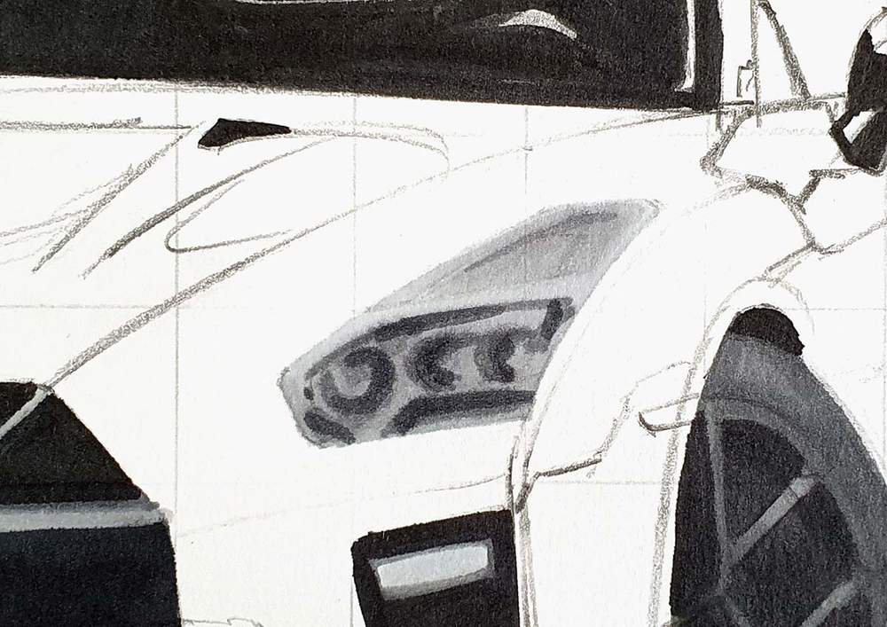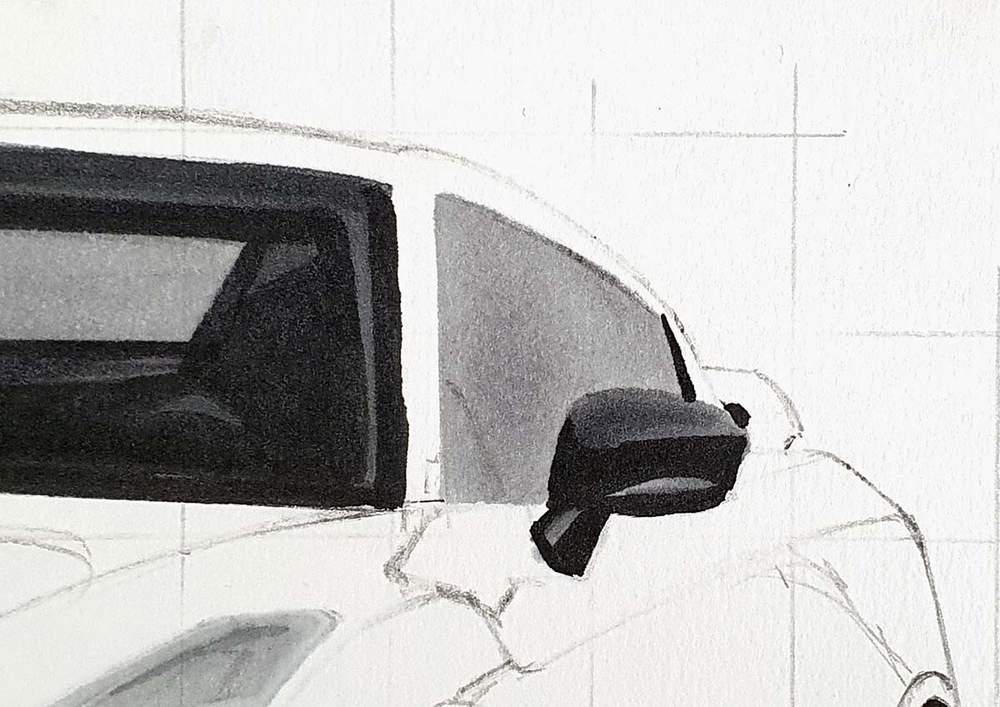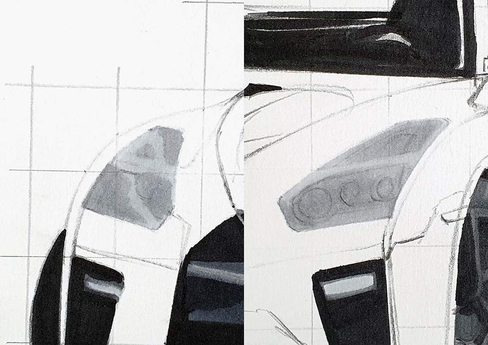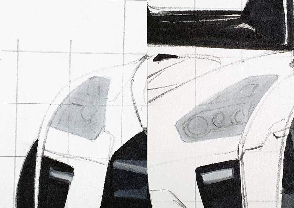 I always start on the left of the car. I chose a line I wanted to sketch, marked where it starts, where it crosses grid lines, and where it ends, and then I sketched it in one swift motion.