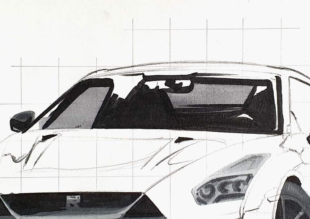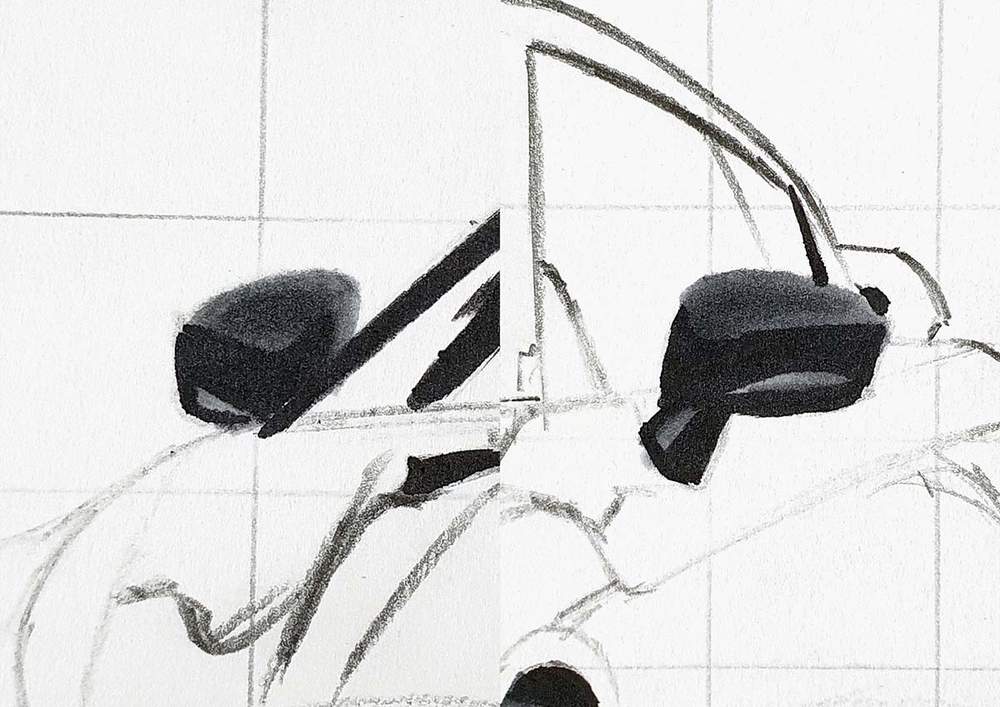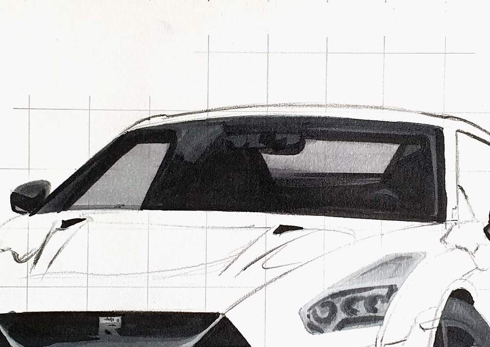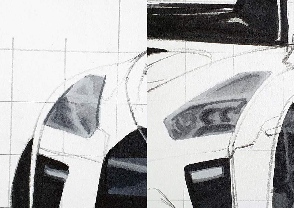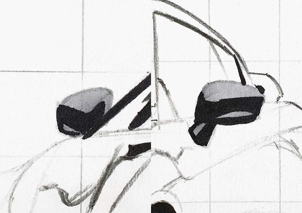 I always start on the left of the car. I chose a line I wanted to sketch, marked where it starts, where it crosses grid lines, and where it ends, and then I sketched it in one swift motion.