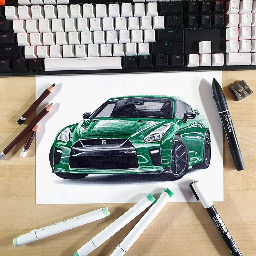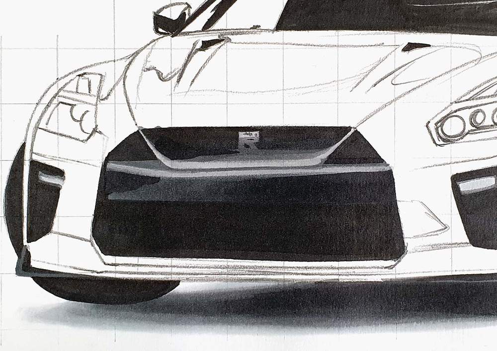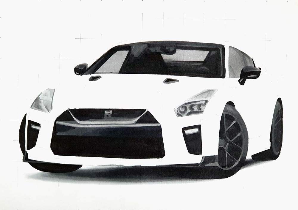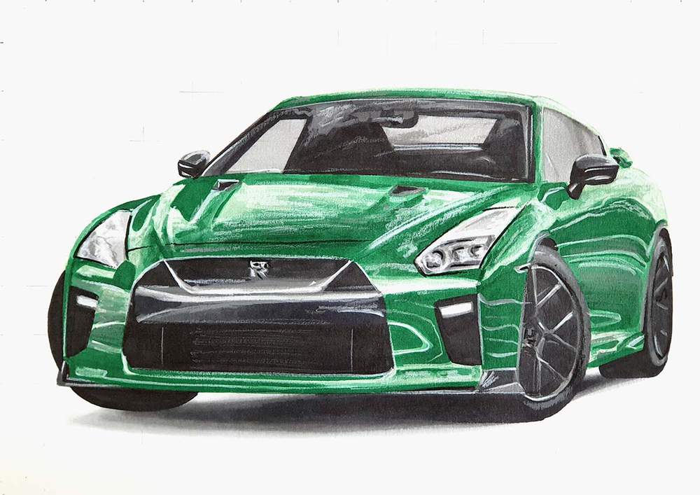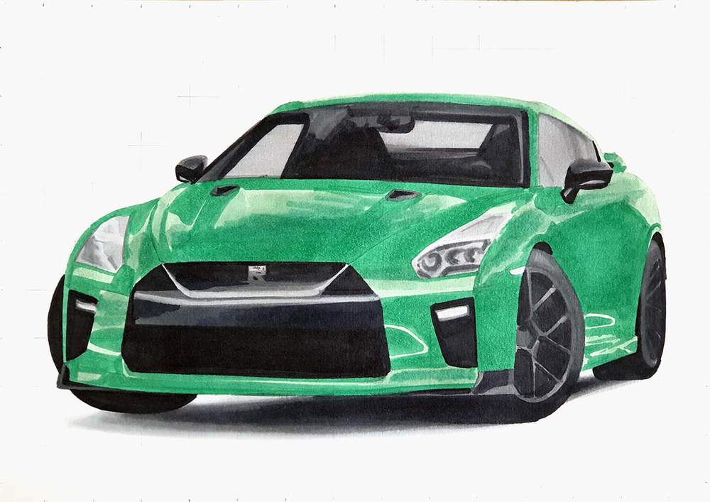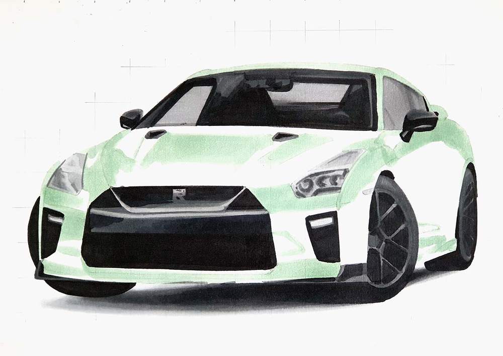 Next, color the car with alcohol markers starting with the black and the grey parts, before moving on to the main body of the GTR.