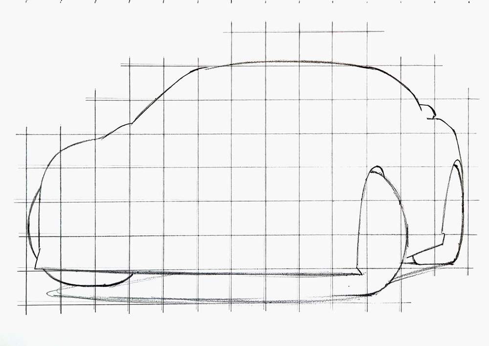 After that, create a sketch of the outline of the car using the grid method.