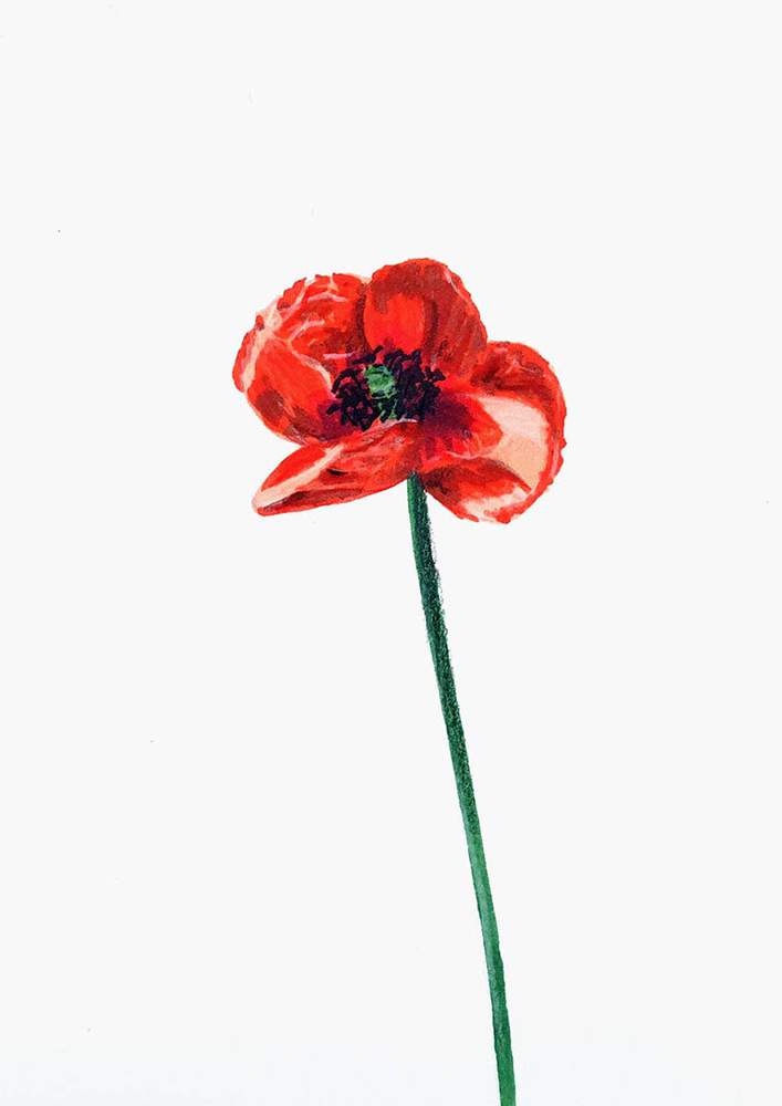 To draw a poppy flower, you first sketch the basic outline. Then, you sketch the petals and the stem. Next, you color the poppy flower with markers, building the colors up from light to dark. And to finish it off, you add a few details with colored pencils and add a few white highlights.