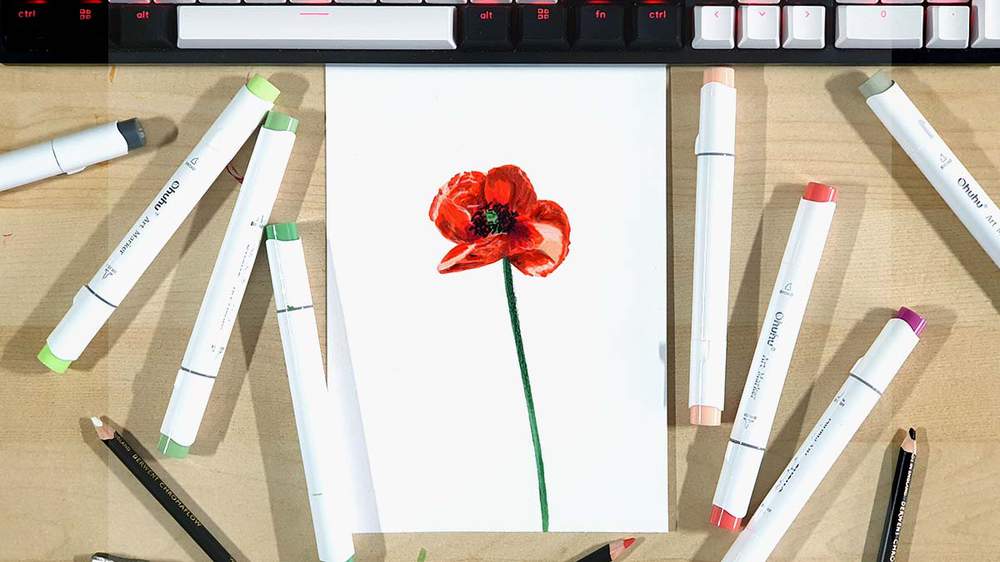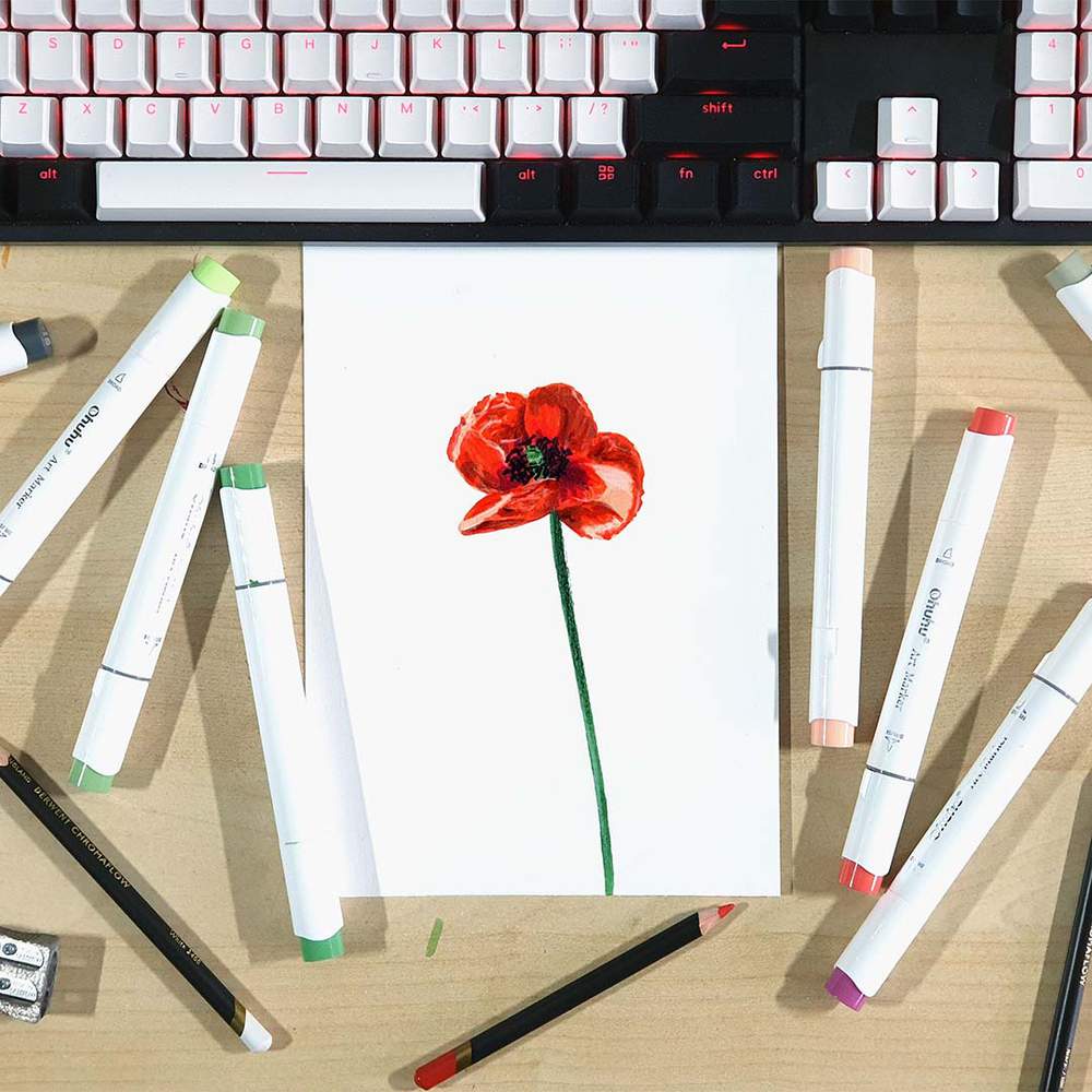I really like alcohol markers, so that's what I chose to use to create this poppy flower drawing.