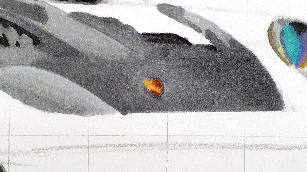 I used a White and a Black colored pencil to add in the details of both headlights. I also refined the air outlets above the front wheel using a Black pencil.