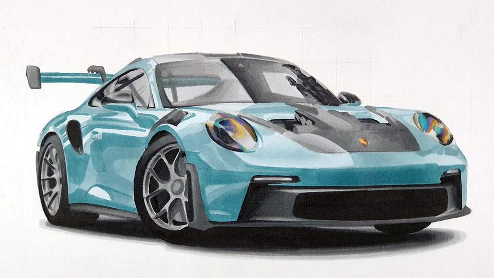 We're going to color the Porsche 911 GT3 RS a beautiful grey-green color. I wanted to draw a car in this color for a while now, and this seemed like the perfect one for this color.