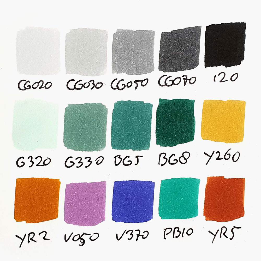 - Ohuhu Honolulu markers in the colors Neutral Grey 02 (CG020), Neutral Grey 03 (CG030), Neutral Grey 05 (CG050), Neutral Grey 07 (CG070), Black (120), Jade Green (G320), Mineral Green (G330), Dolphin Blue (BG5), Teal (BG8), Yellow Dahlia (Y260), Marigold (YR2), Pearl Violet (V050), Blue Bell (V370), Turguoise Green Light (PB10), and Terra Cotta (YR5). (Also available individually here.);