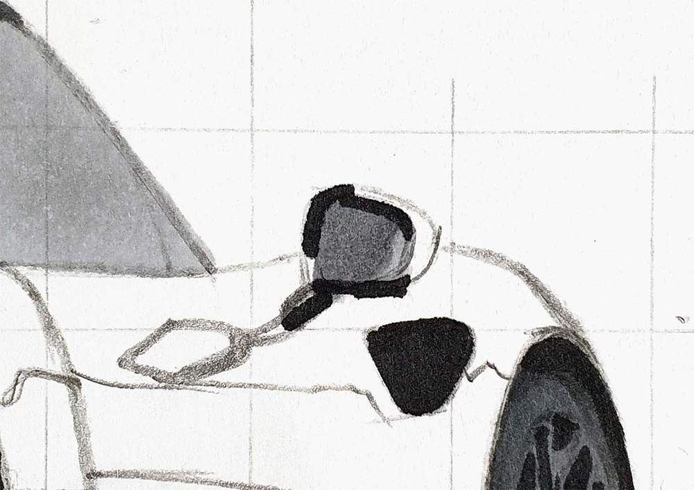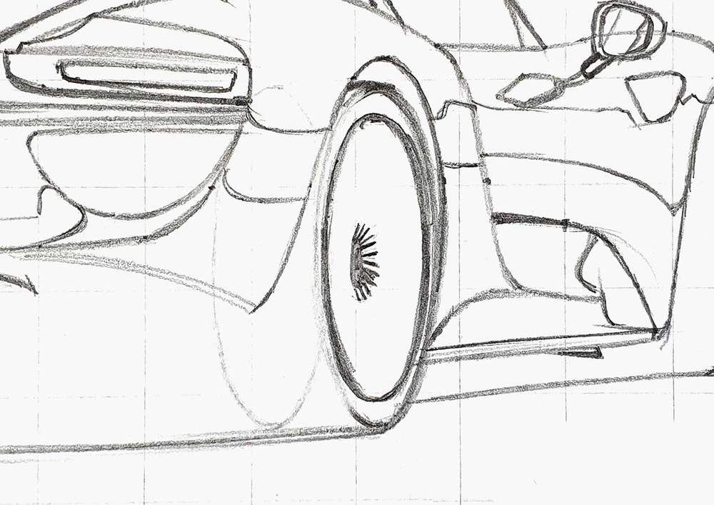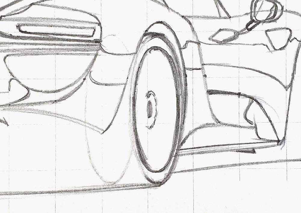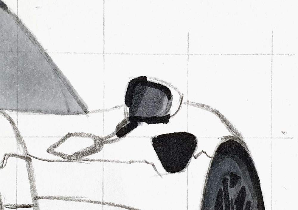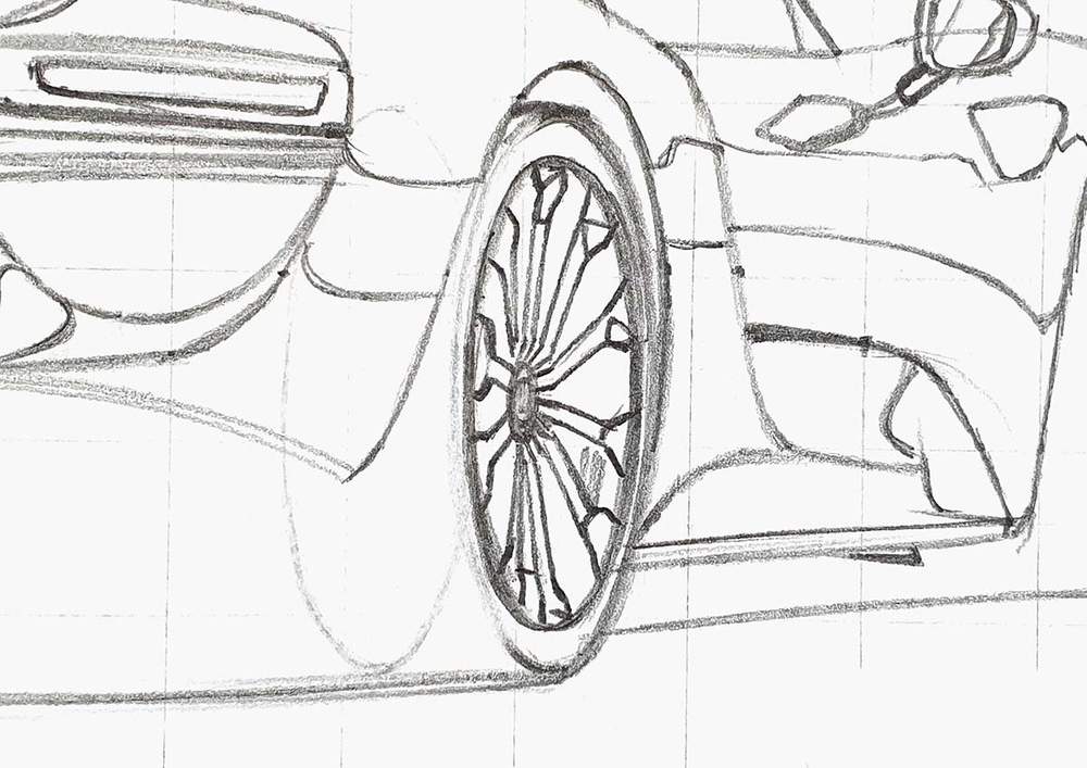 Now that the outline is done, it's easier to sketch in all the basic shapes of the car.