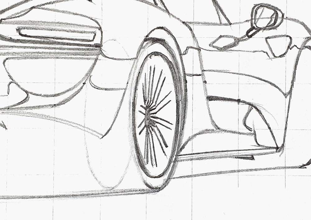 The first step of drawing a car like the Porsche 918 Spyder is to sketch the outline and all the parts of the car.