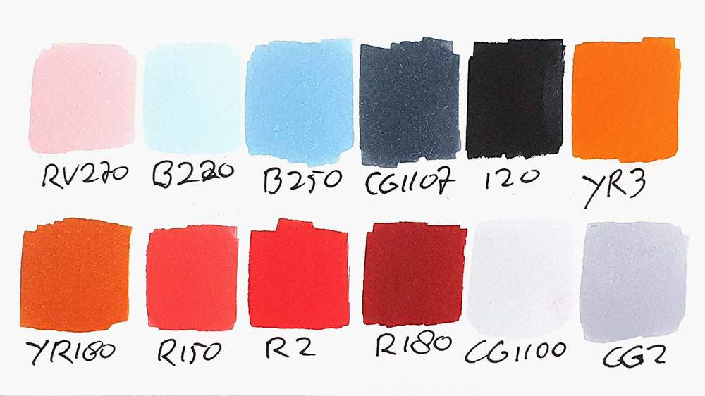 To make this adorable snowman drawing, I used Ohuhu Honolulu markers in the colors Colorless Blender (0), Shadow Pink (RV270), Pale Grayish Blue (B220), Light Blue (B250), Cool Grey II 07 (CGII07), Black (120), Orange (YR3), Lipstick Orange (YR180), Zinnober (R150), Vermilion (R2), Bright Red (R180), Cool Grey II 0 (CGII00), and Cool Grey II 2 (CG2).