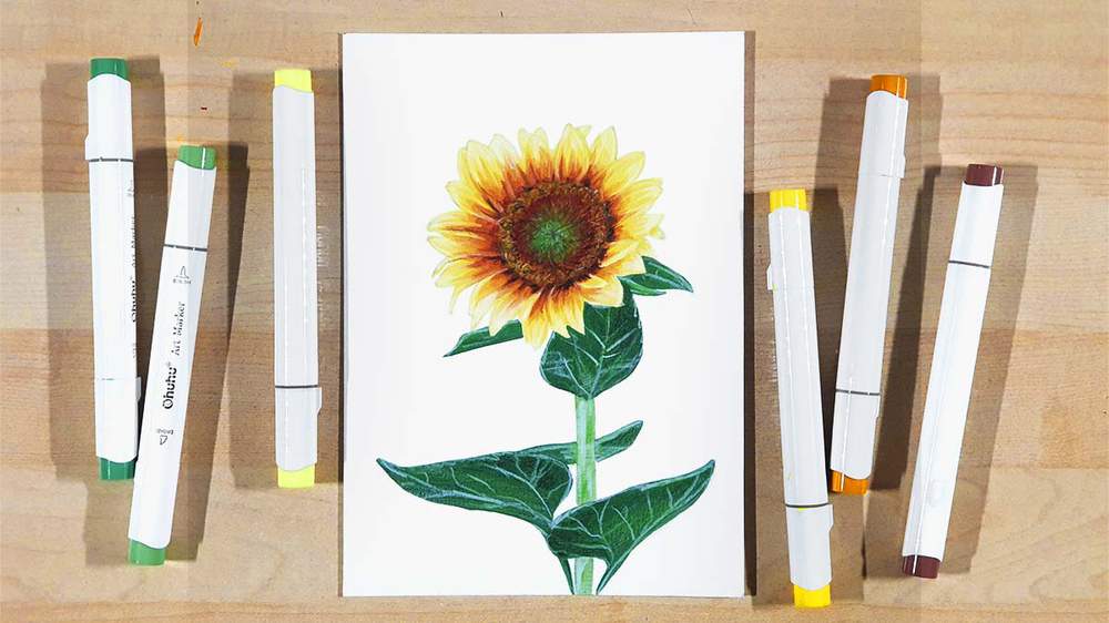 Now that the sketch is all done, it’s time to start coloring the sunflower using some alcohol markers.