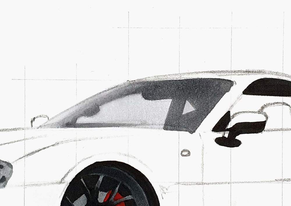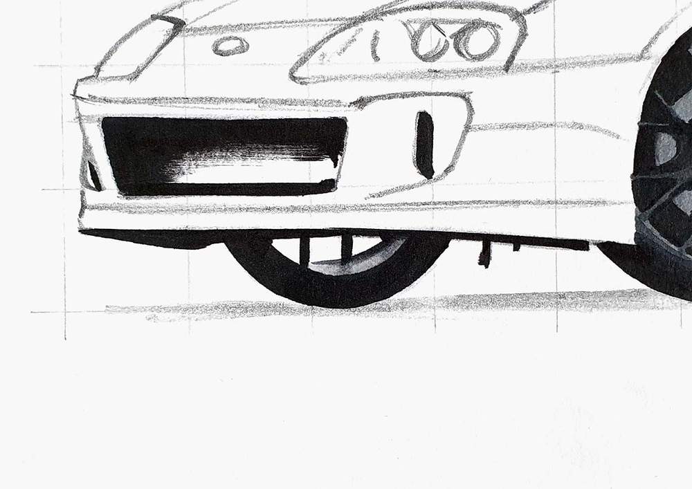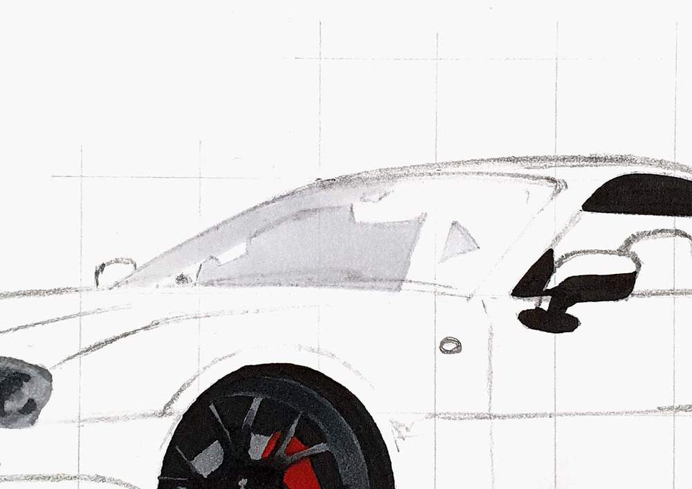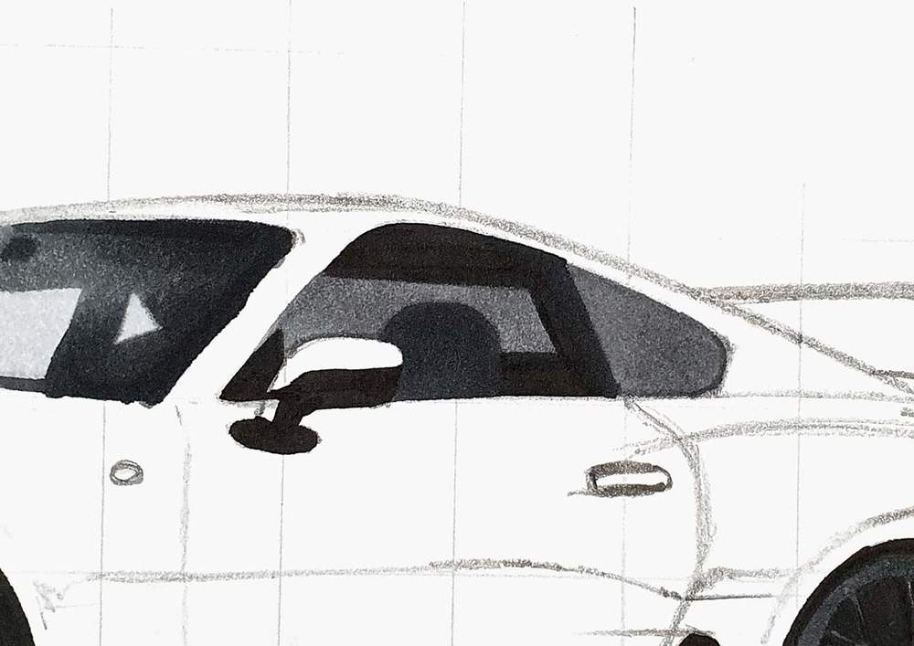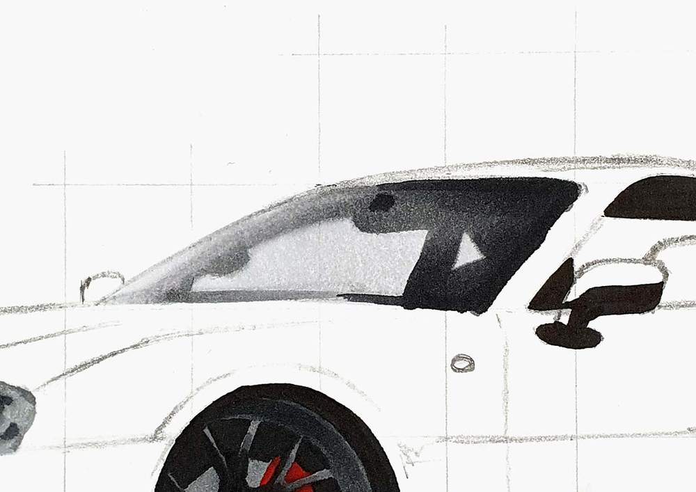 To add the details to the Toyota Supra car drawing, I like to use colored pencils, and in this case, a white and a black pencil will do the trick.