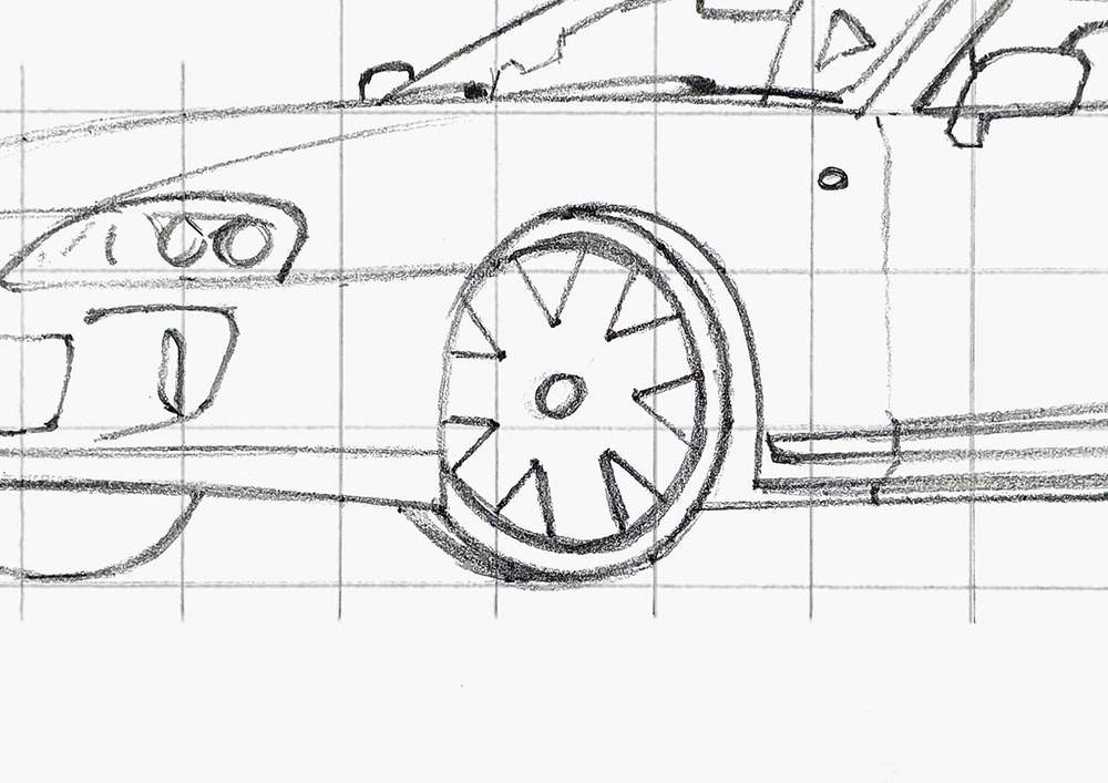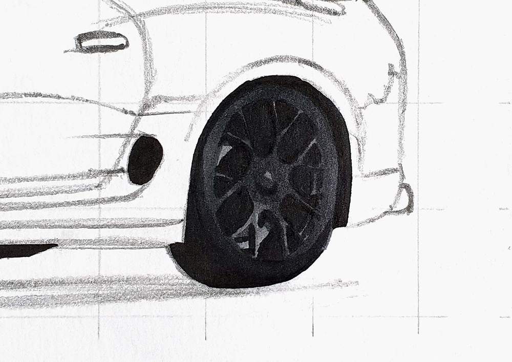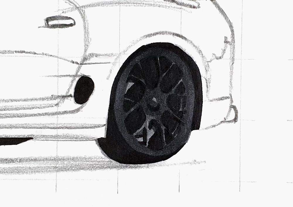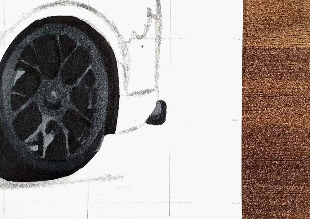 After that, I repeated these steps for the rear wheel and sketched the visible parts of the wheels on the other side of the car, along with the shadow underneath the vehicle.