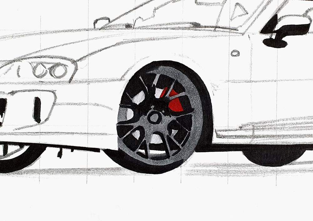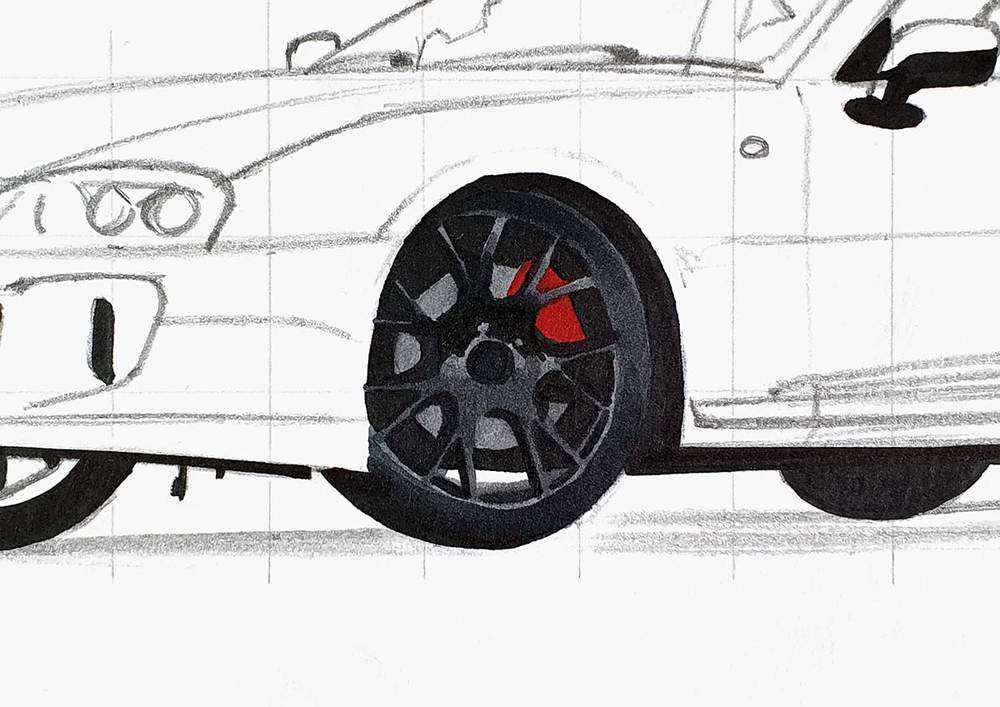 I used the black pencil to add the panel gaps, the door lines, and this one line on the red brake caliper.