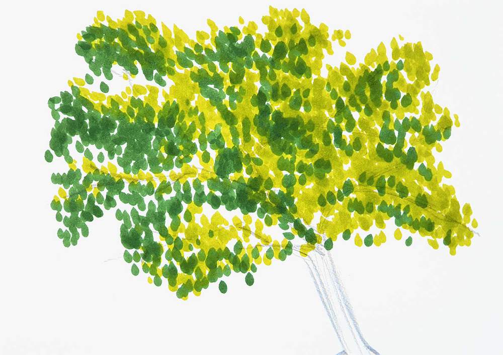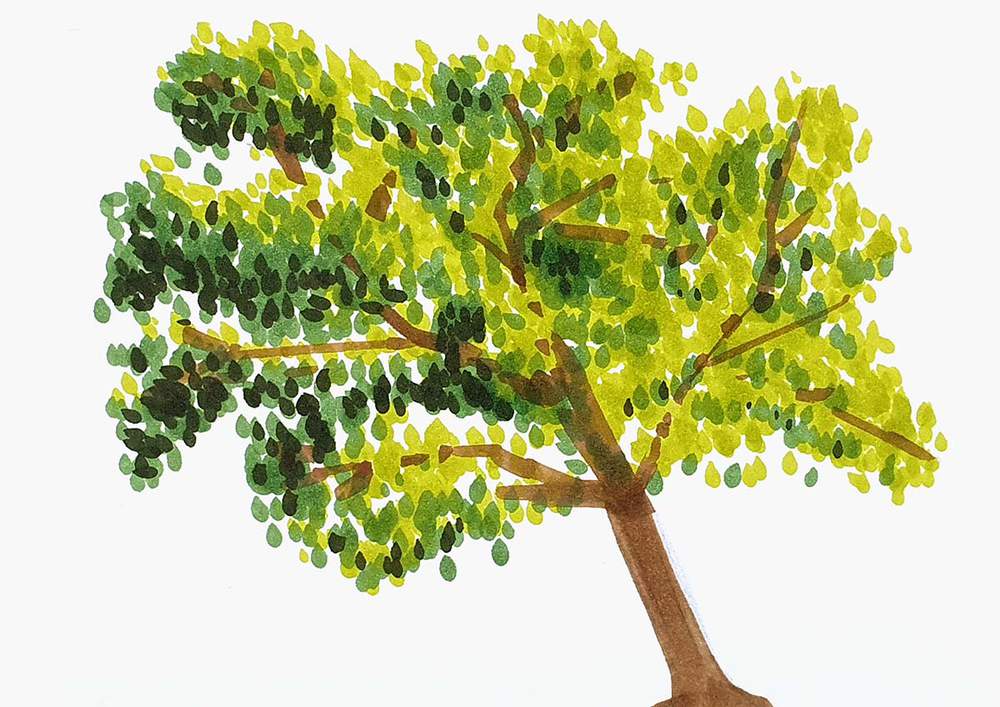 To draw a tree, you first sketch the tree trunk. Make it look crooked and organic. Then you sketch the branches. Include sharp angles and add branches onto branches. Then you color the leaves by adding tons of dots using multiple green markers. Lastly, you color the trunk and the branches with a light and dark brown marker. Make sure to skip some parts where the leaves are covering the branches.