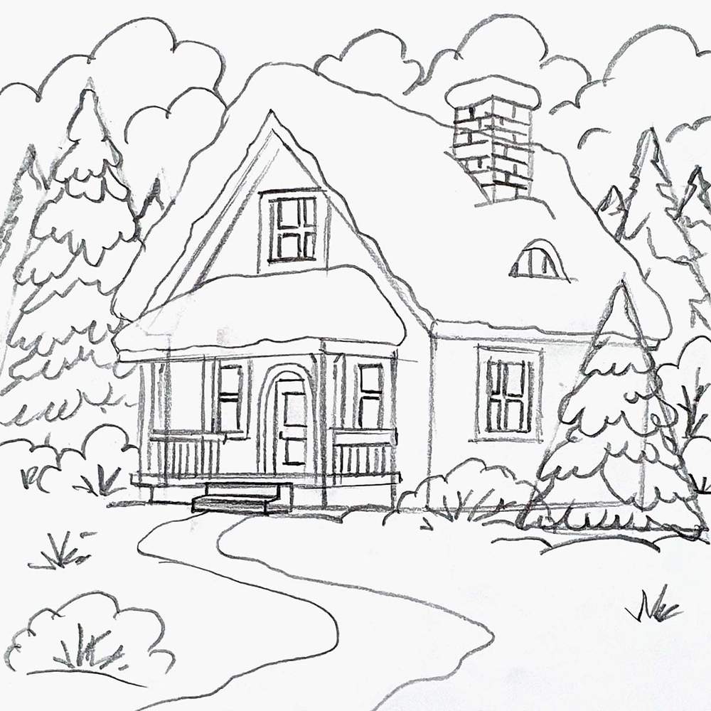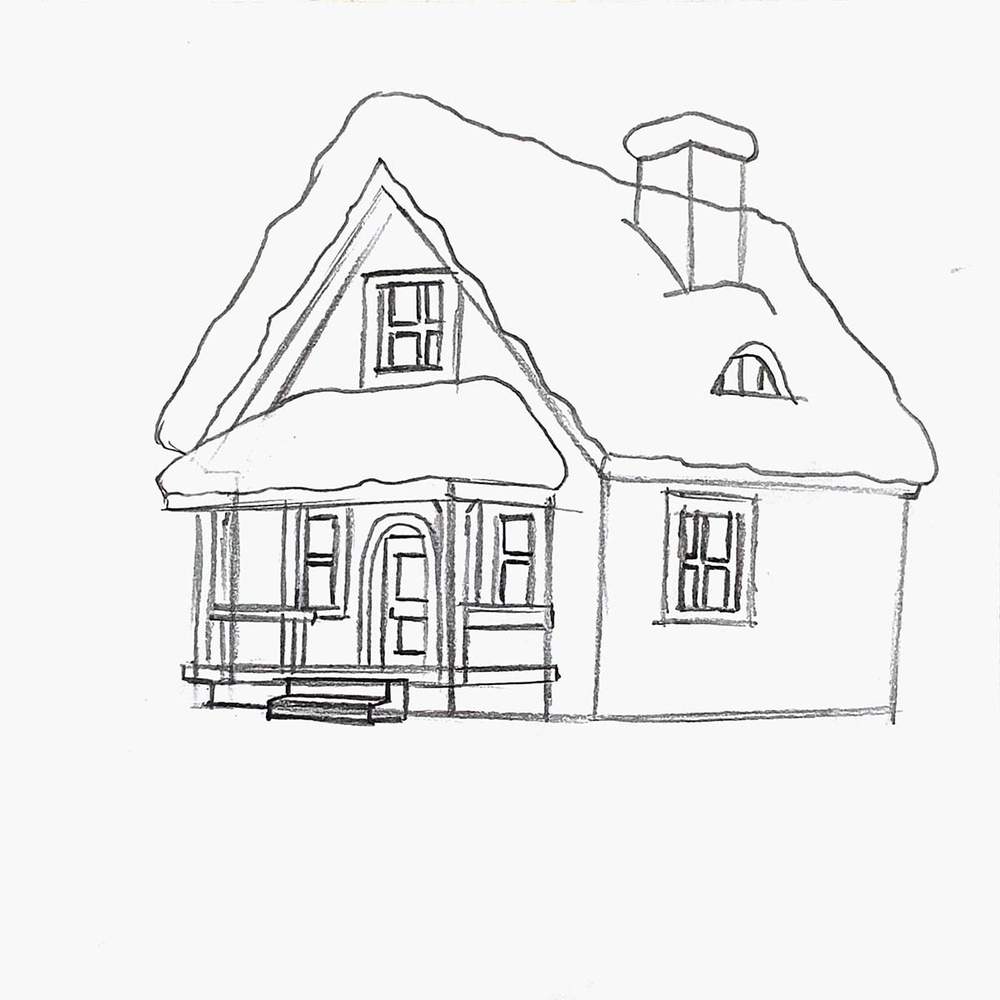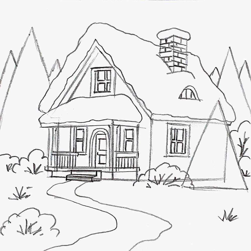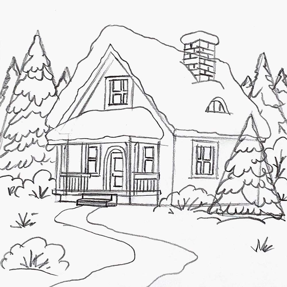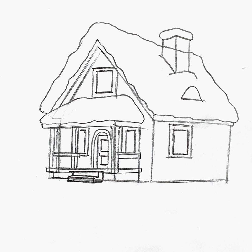 To draw our cozy winter house, I first sketched the basic shape of the house.