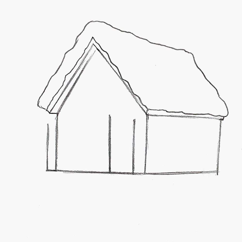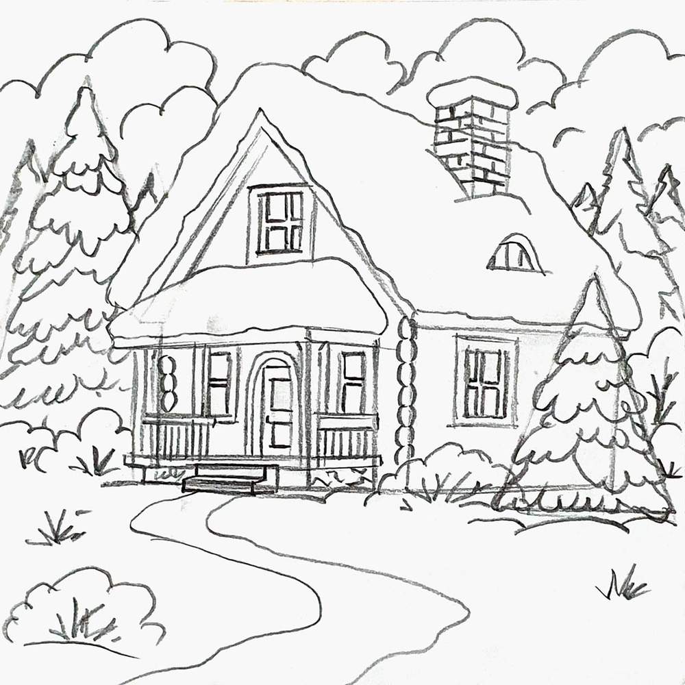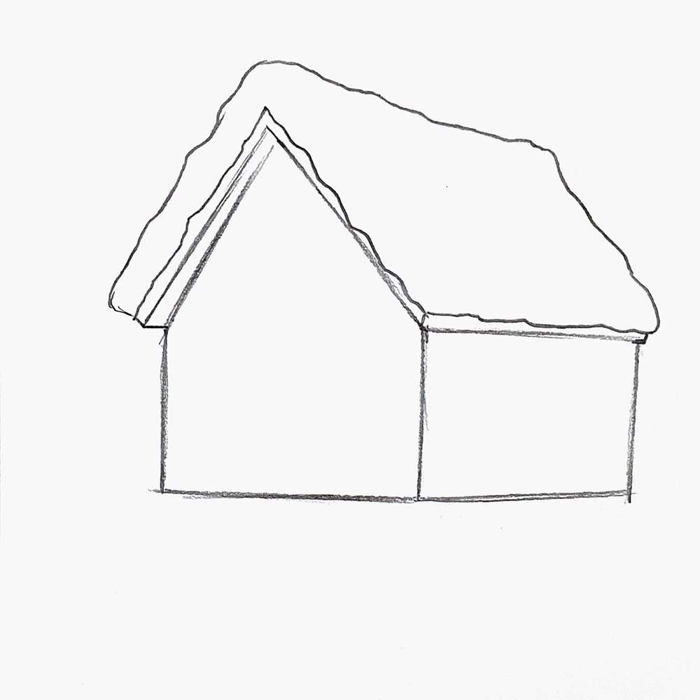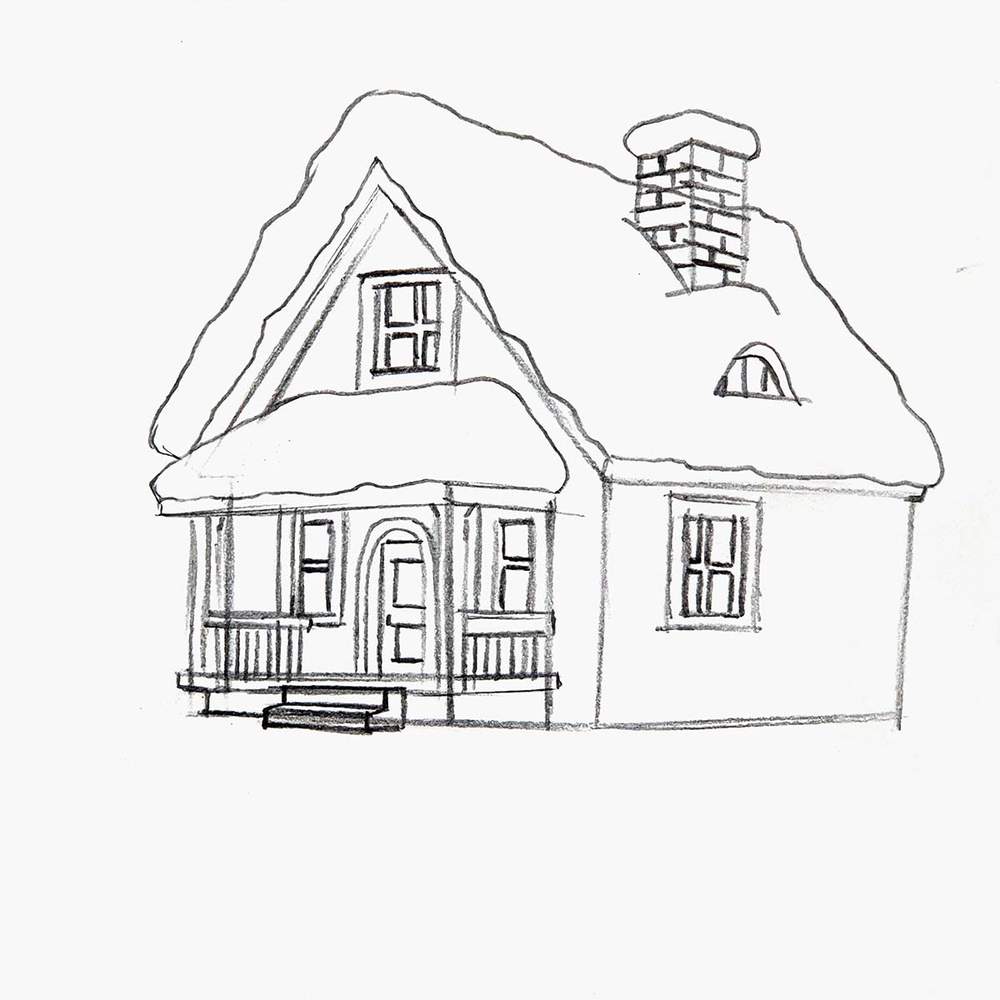 To draw our cozy winter house, I first sketched the basic shape of the house.