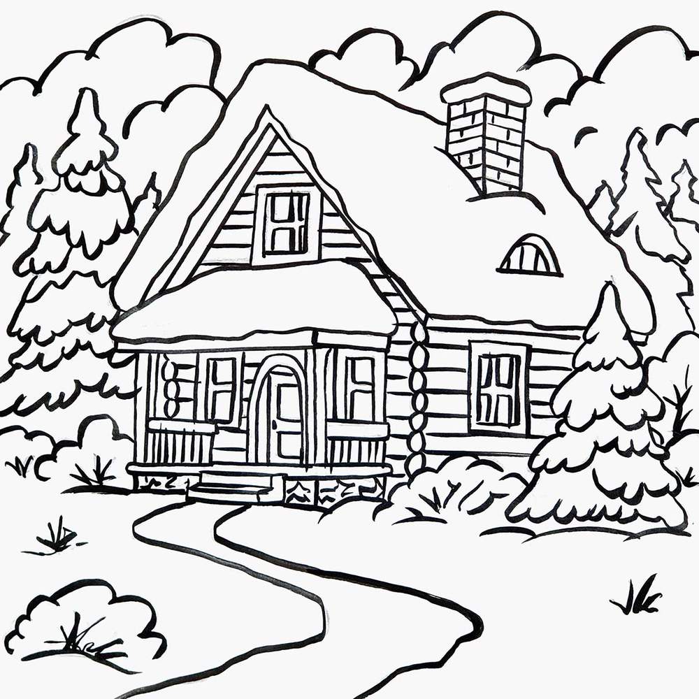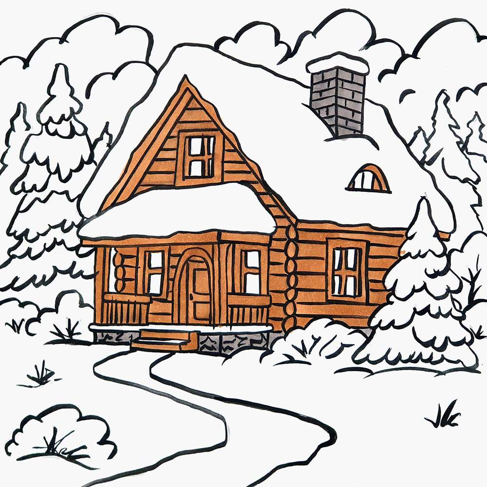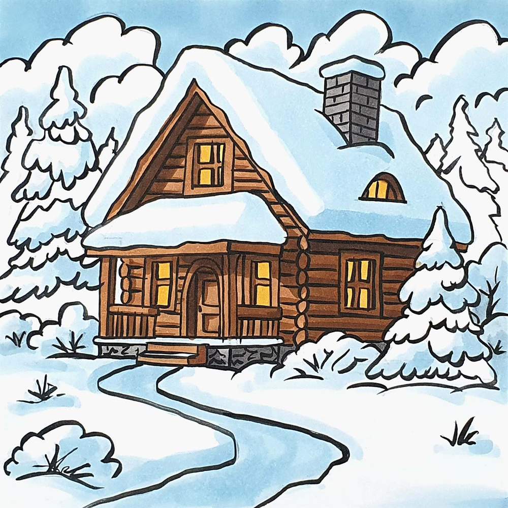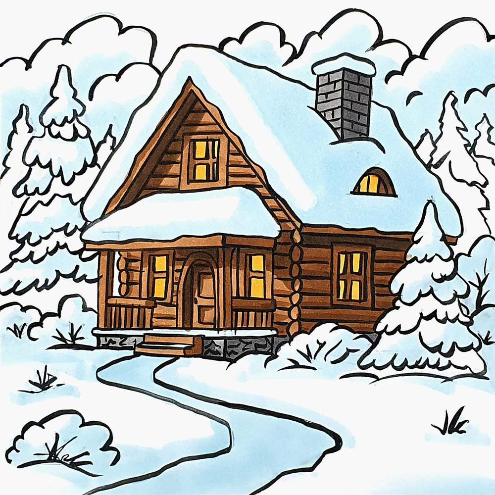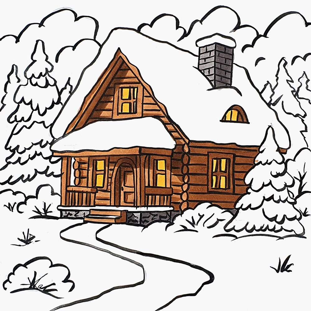 And that’s how I drew this cozy winter house scene, complete with log walls, snowy trees, and a winding path leading up to the front door.