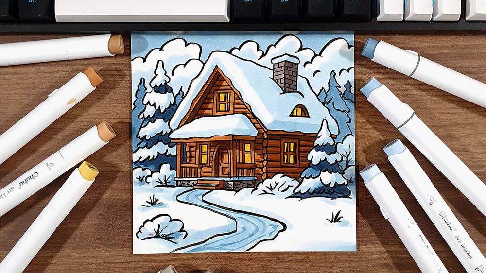 In this easy step-by-step guide, I’ll show you exactly how I drew a cozy winter house scene, from the first sketch to the final layer of snowy marker shading.