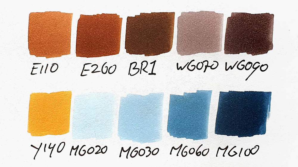 To make this drawing, I used Ohuhu Honolulu markers in the colors Nugget (Y140), Dark Suntan (E110), Leather (E260), Raw Umber (BR1), Warm Grey 07 (WG070), Warm Grey 09 (WG090), Blue Grey 02 (MG020), Blue Grey 03 (MG030), Blue Grey 06 (MG060), and Blue Grey 09 (MG100).